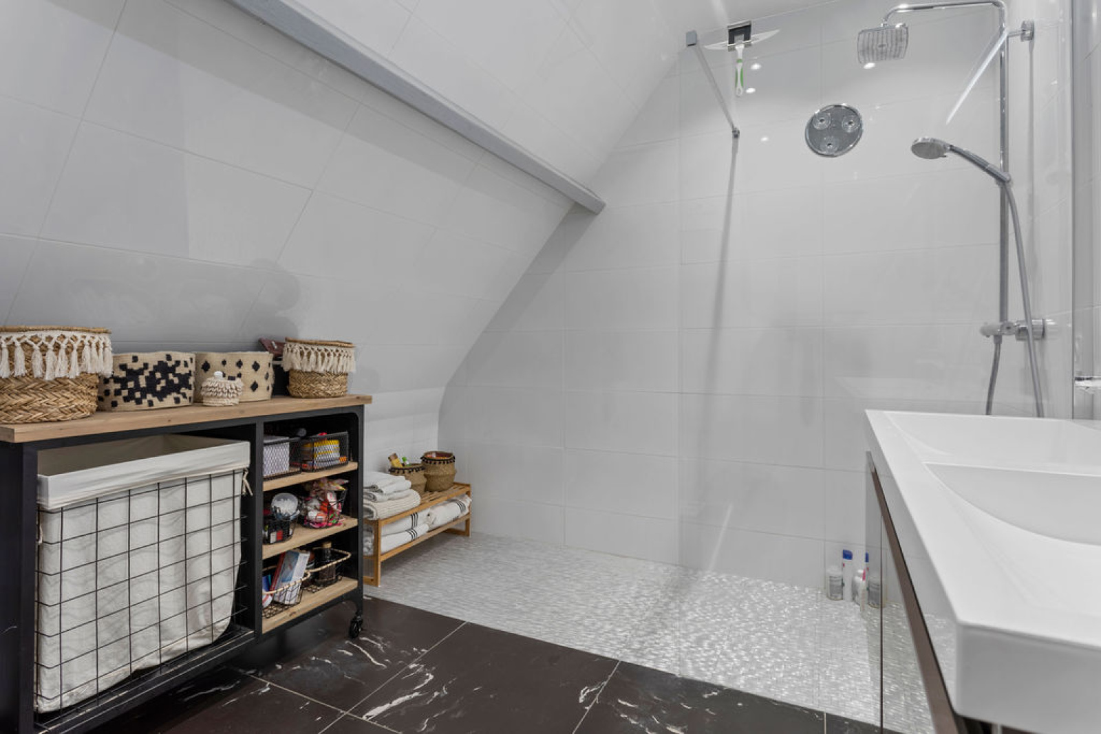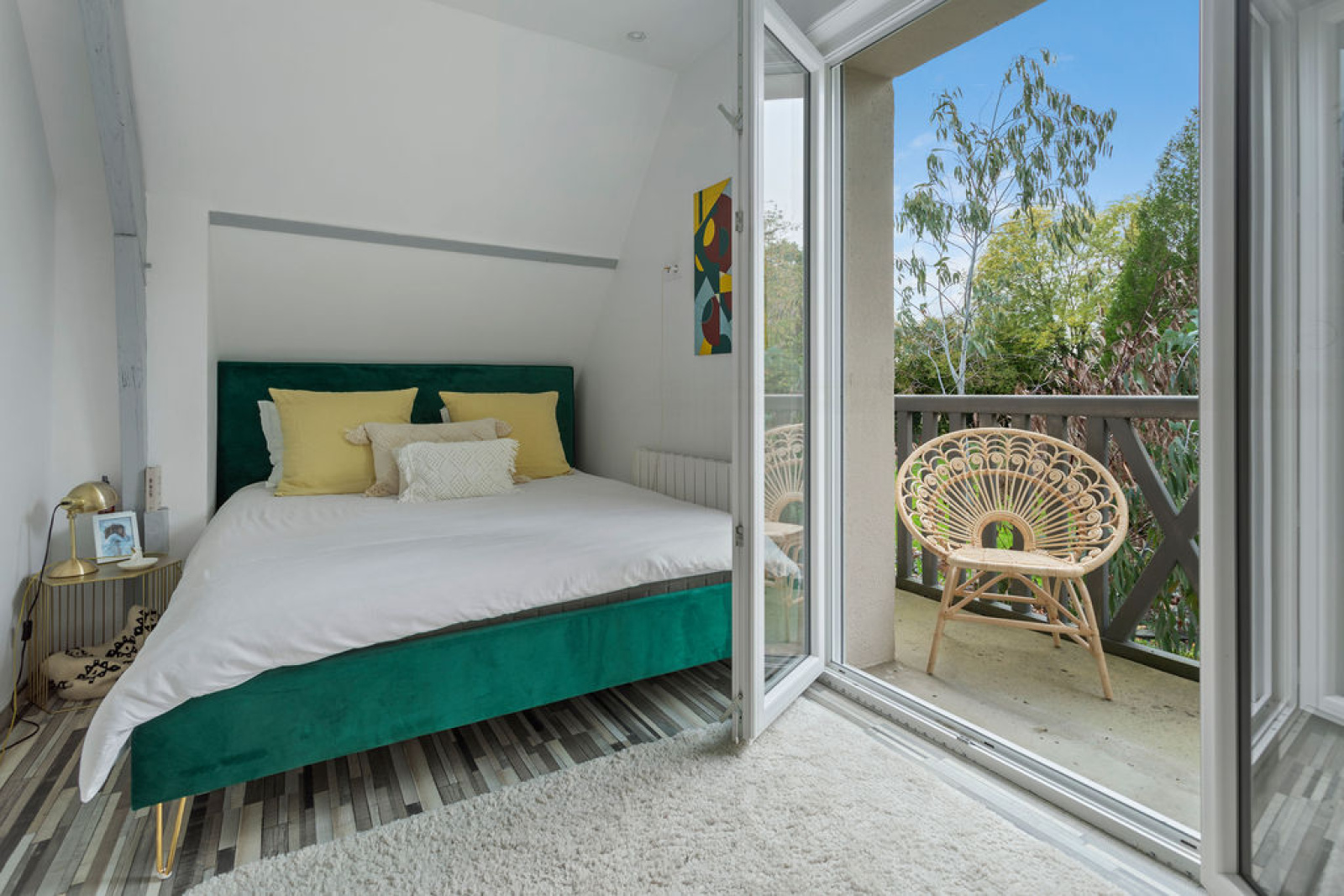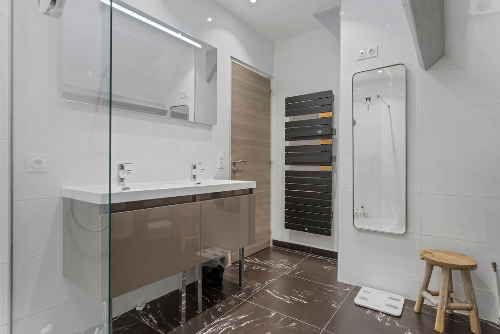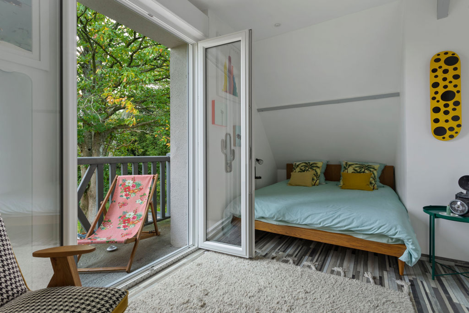 A l’étage, deux grandes chambres avec balcon, deux chambres d’enfants, une salle de douche et un WC séparé.