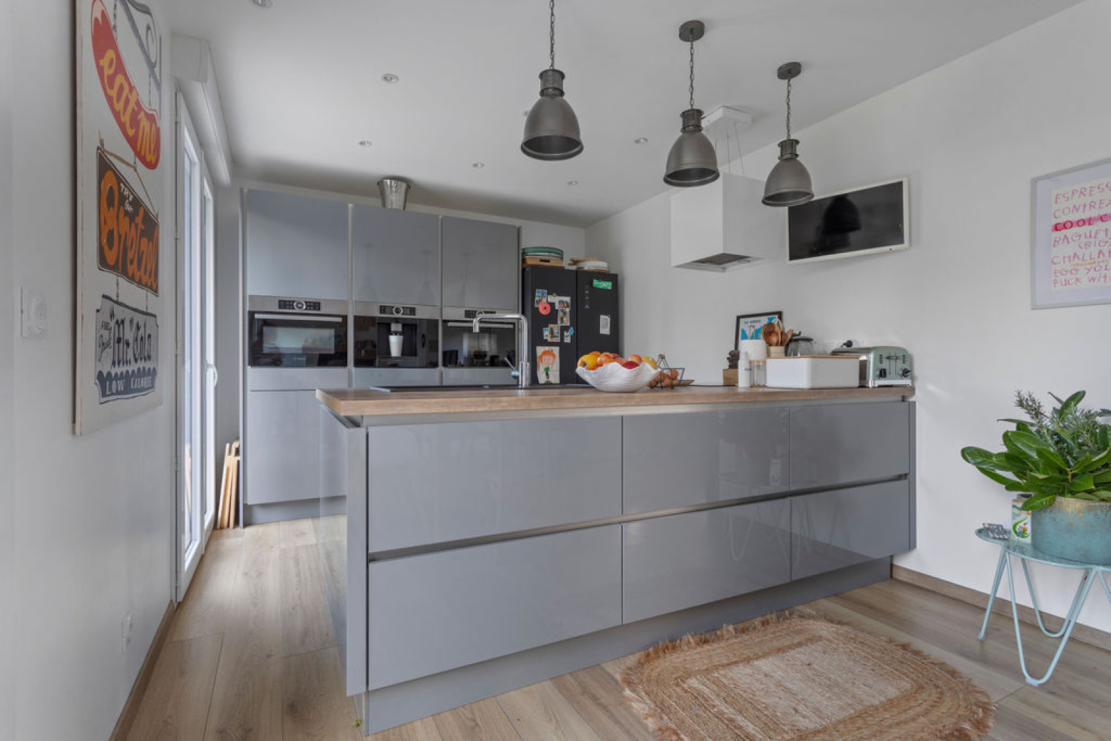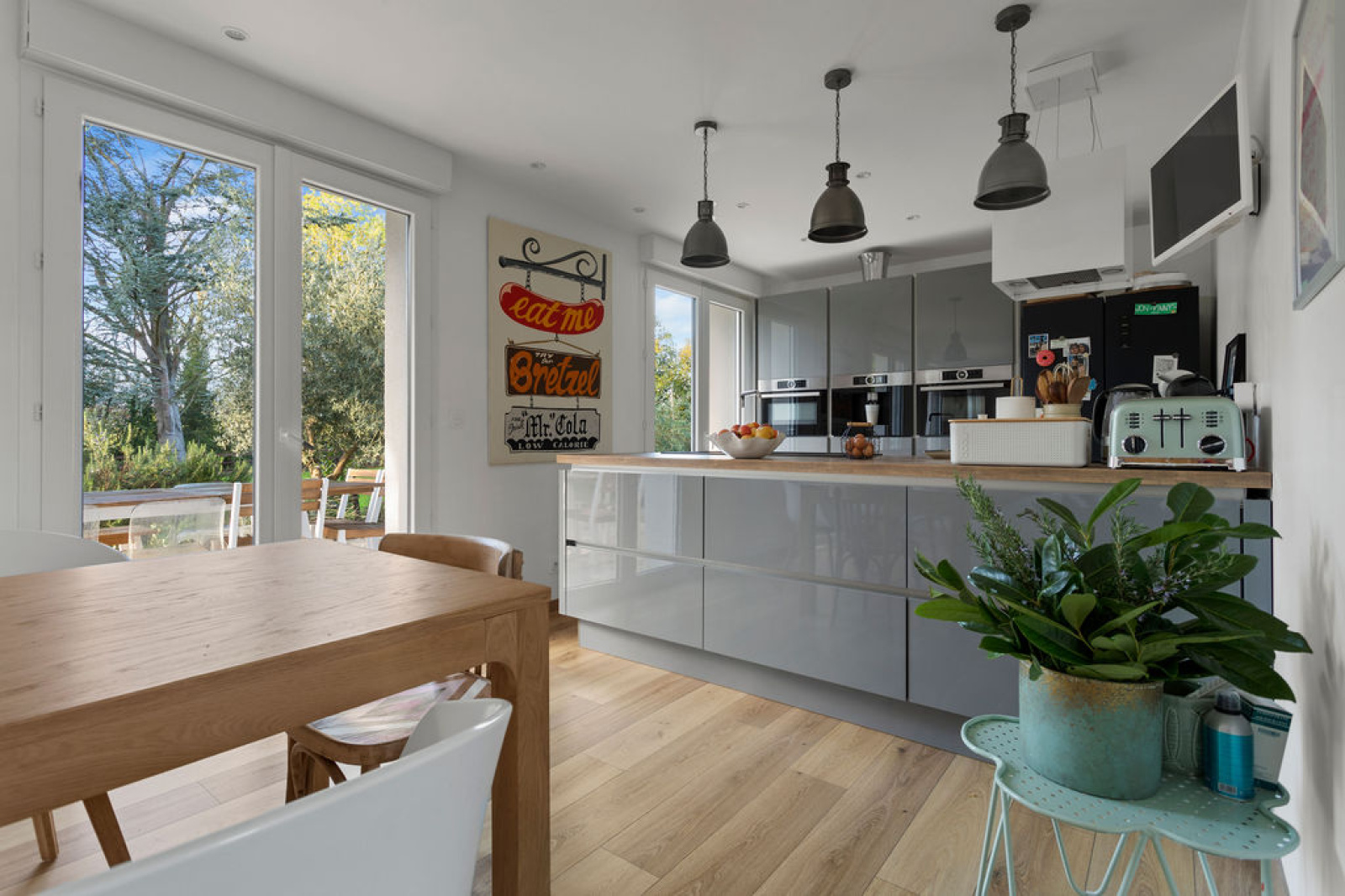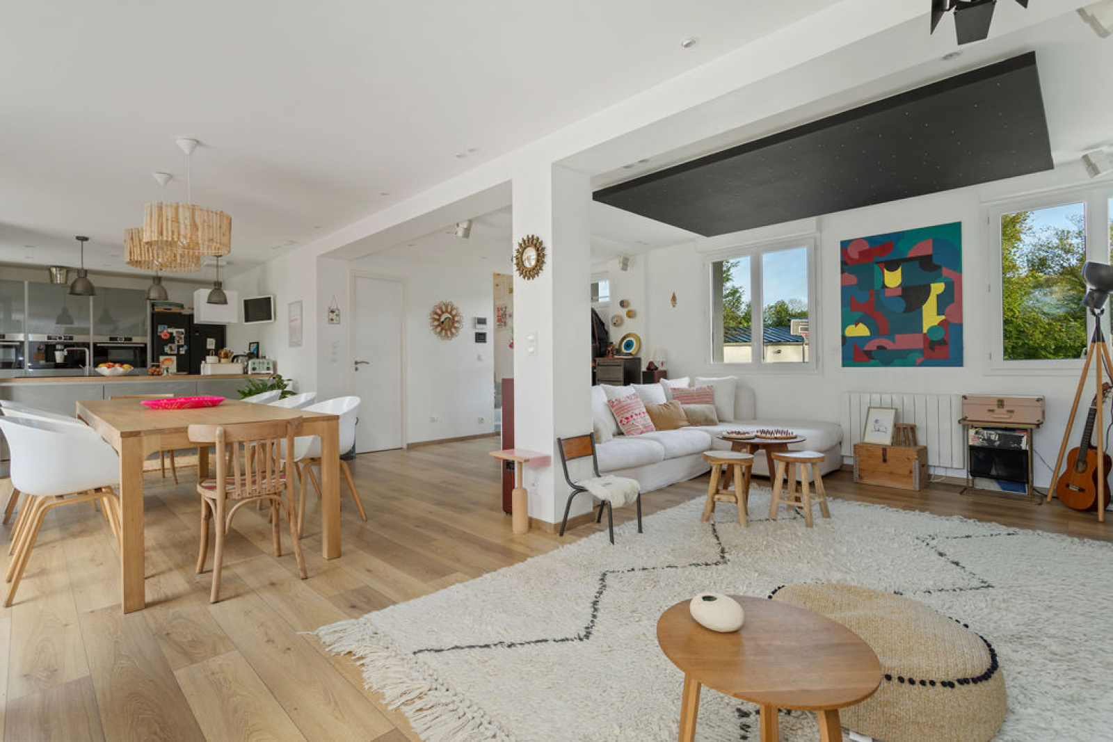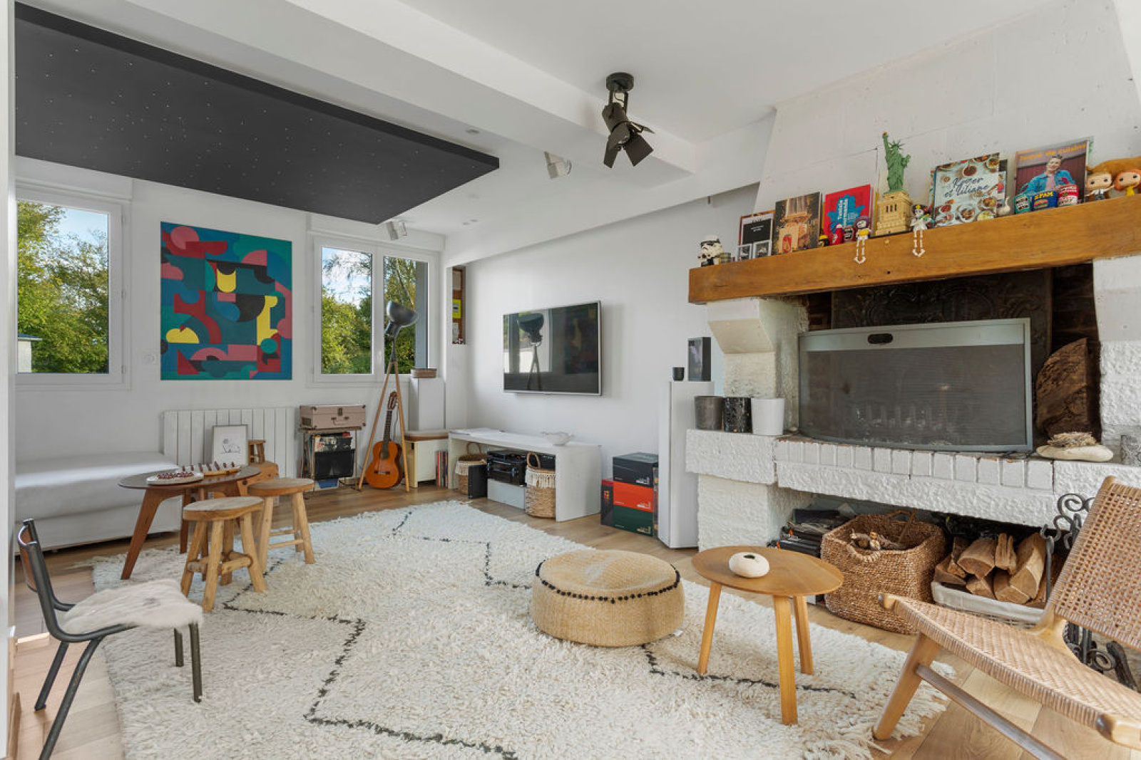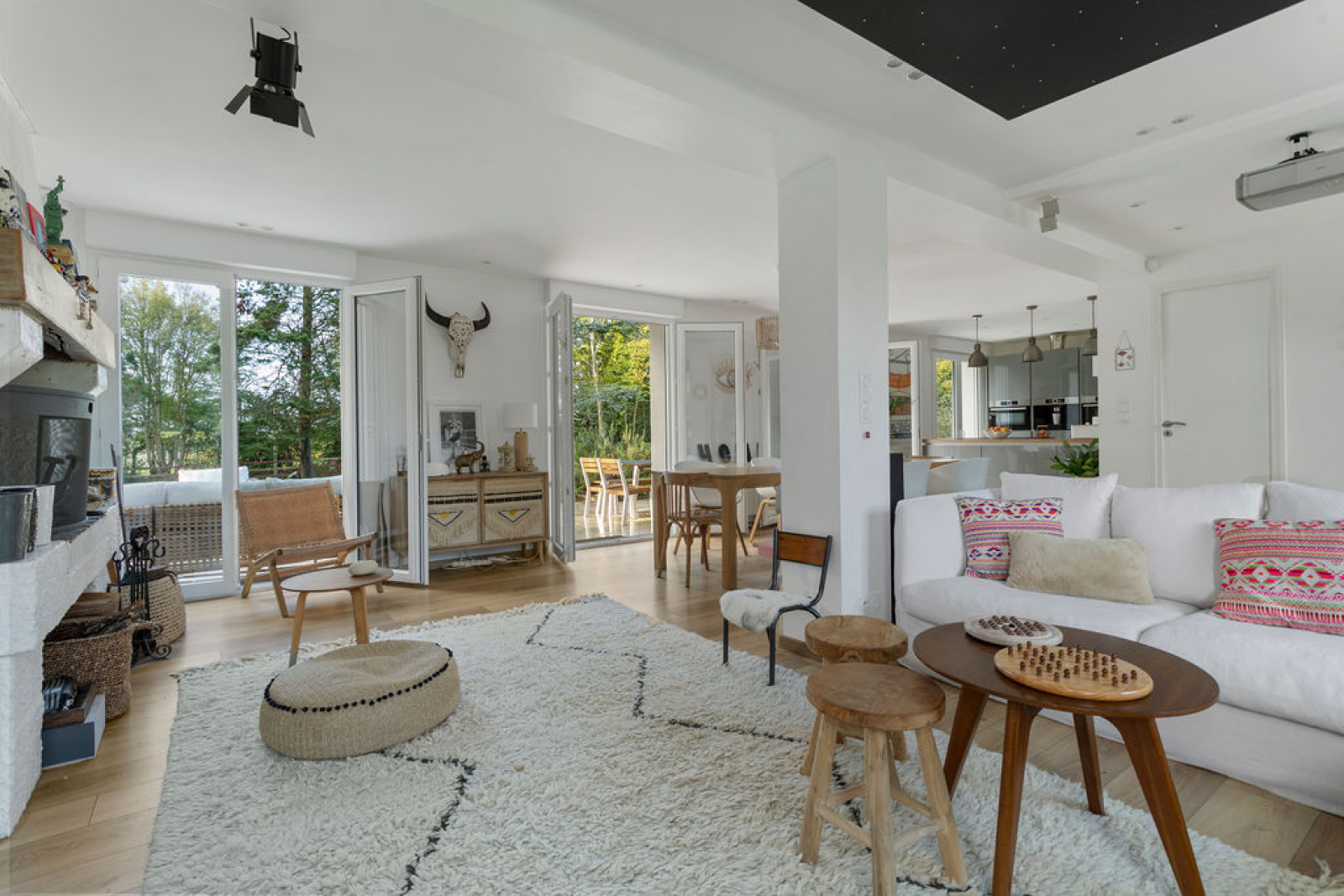 Elle se compose au rez-de-chaussée, d’un grand séjour avec cheminée, d’une cuisine américaine équipée, d’une buanderie et d’un WC invités.