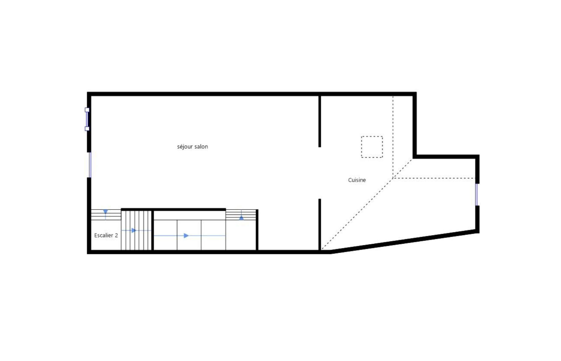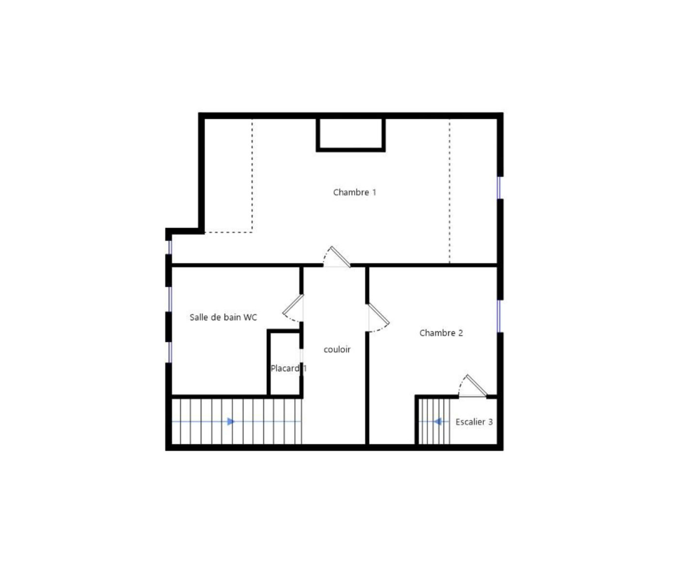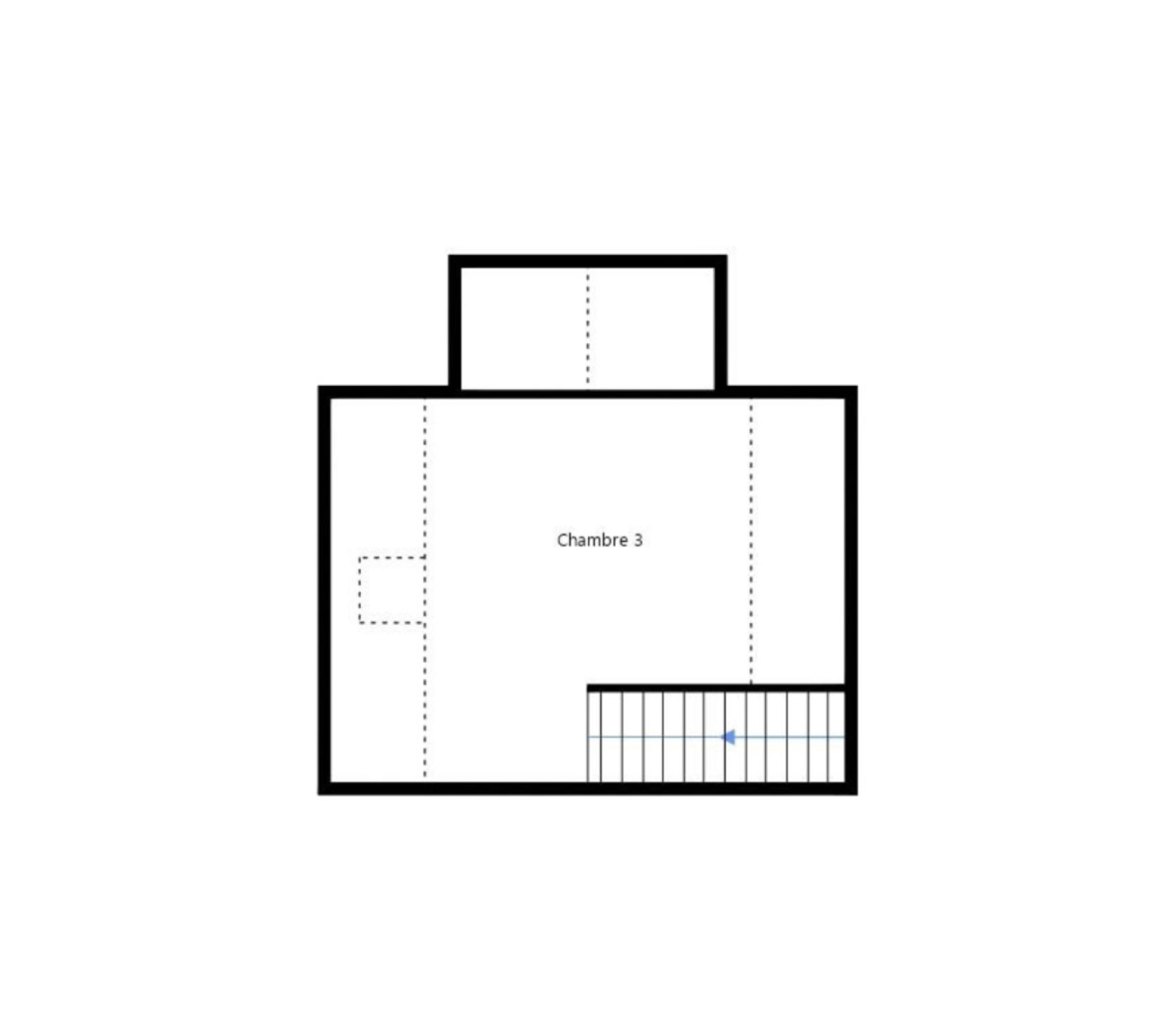 Il se compose d’un grand salon donnant sur une cuisine ouverte et équipée, d’une grande chambre, d’une salle de bains et d’un WC, d’une petite chambre (ou bureau) avec un accès à l’étage supérieur où se trouve une chambre mansardée sous les combles.