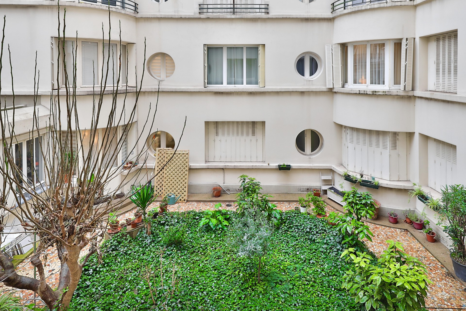 Il se compose d’une pièce principale et d’une cuisine (pouvant être rassemblées) donnant sur une jolie cour verdoyante et d’une salle d’eau avec WC.