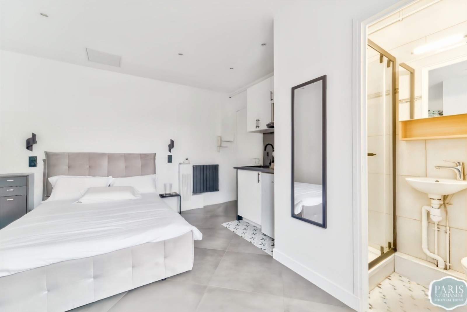 Il se compose d’une grande pièce principale de 13,42m² avec une cuisine ouverte et équipée et d’une salle de douche avec WC.