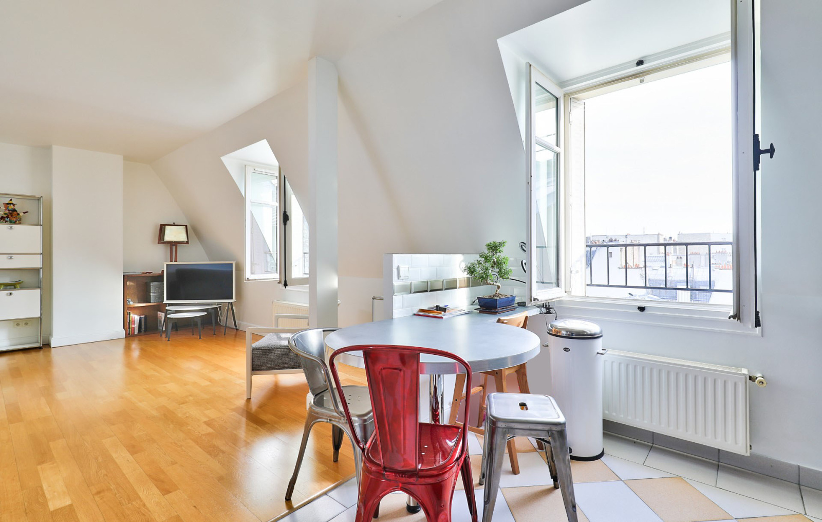 Cet appartement en parfait état, ses multiples vues sur les toits de Paris et son agencement optimisé en font un appartement rare à la vente.