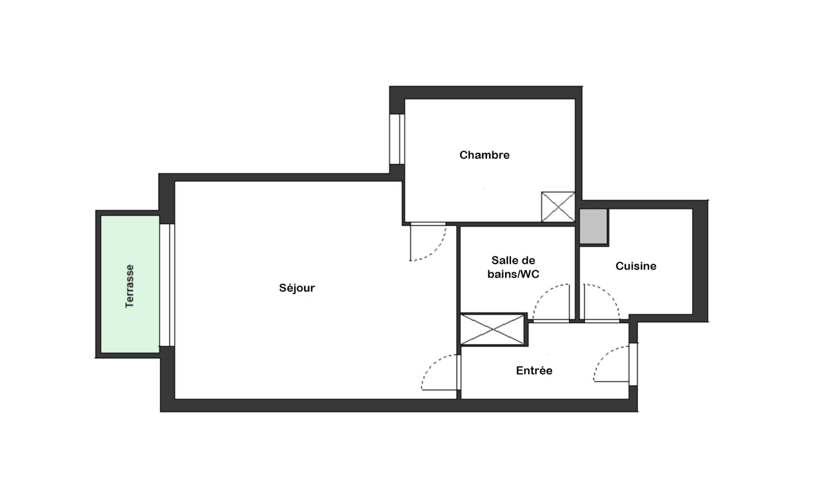 Il se compose d’un grand salon ensoleillé de 23m² donnant sur une petite terrasse, d’une chambre, d’une cuisine équipée et d’une salle de bains avec WC.
