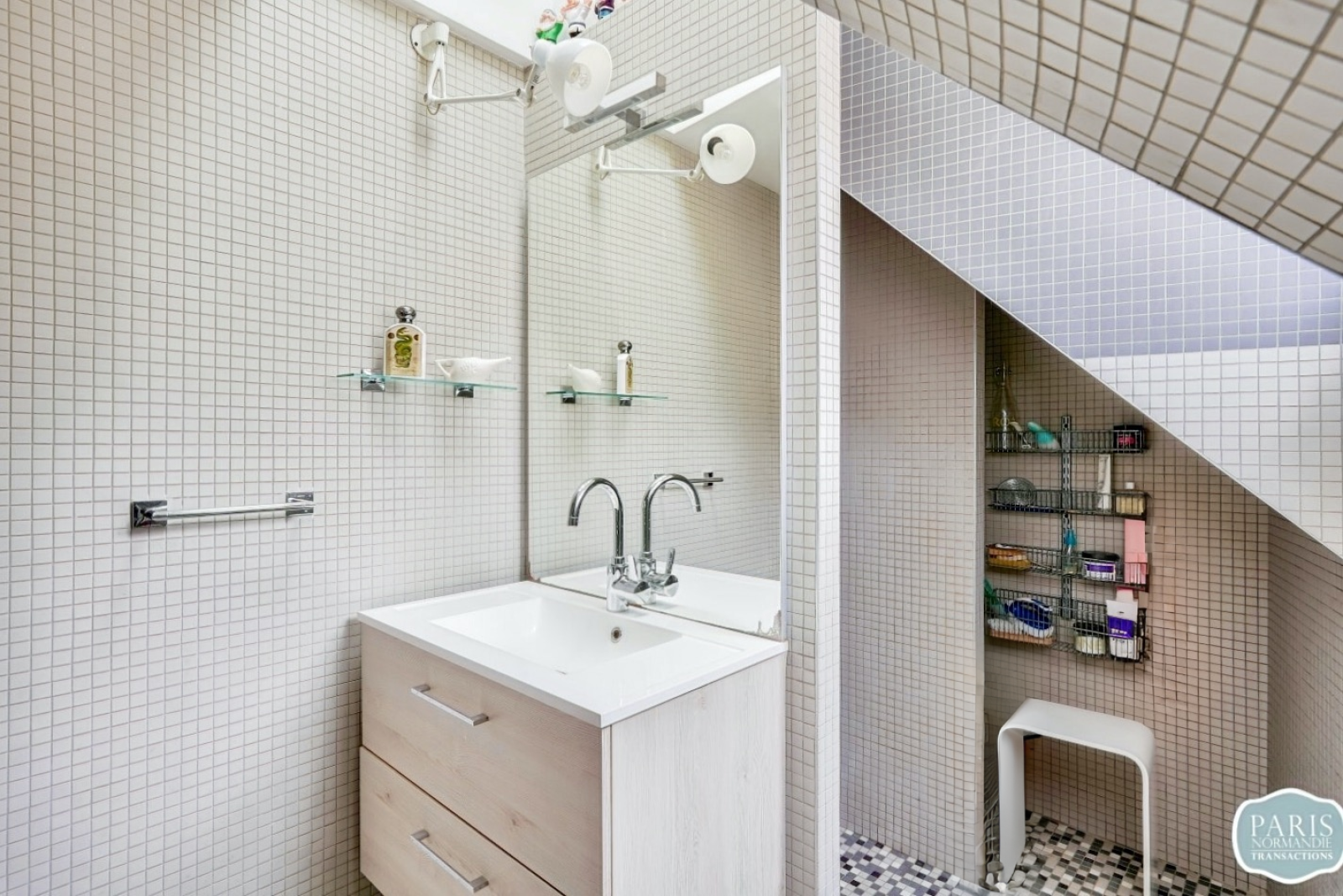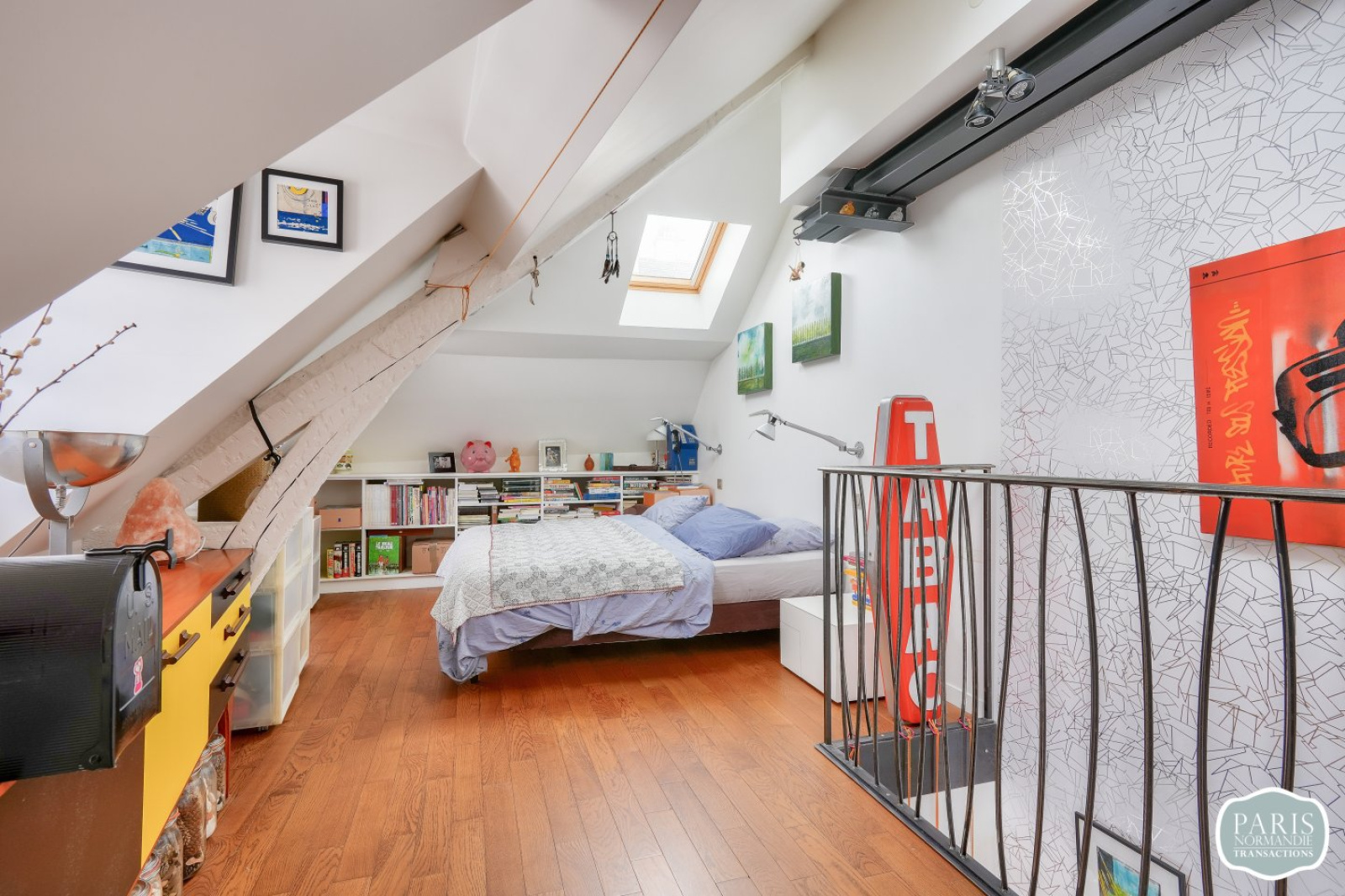 Il se compose d’une belle réception d’angle avec parquet de plus de 29m² intégrant une cuisine américaine équipée et de WC séparés ; à l’étage, accessible par un escalier d’esprit industriel, d’une grande chambre composée d’un espace dressing et d’une salle d’eau pour une surface totale de 19,8m² Carrez et 30m² au sol.