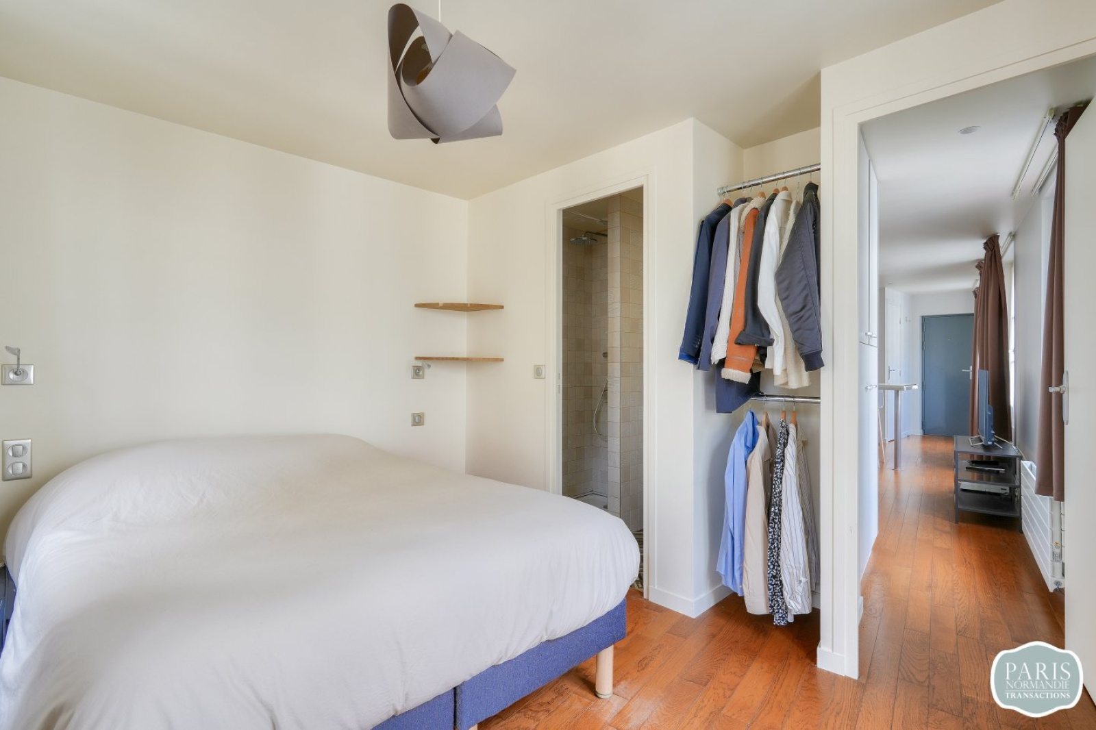 Il se compose d’un séjour avec parquet d’environ 16m² intégrant une cuisine équipée, de WC séparés, d’une chambre d’angle avec rangement et salle d’eau de plus de 10 m² et d’un grand dressing toute hauteur.