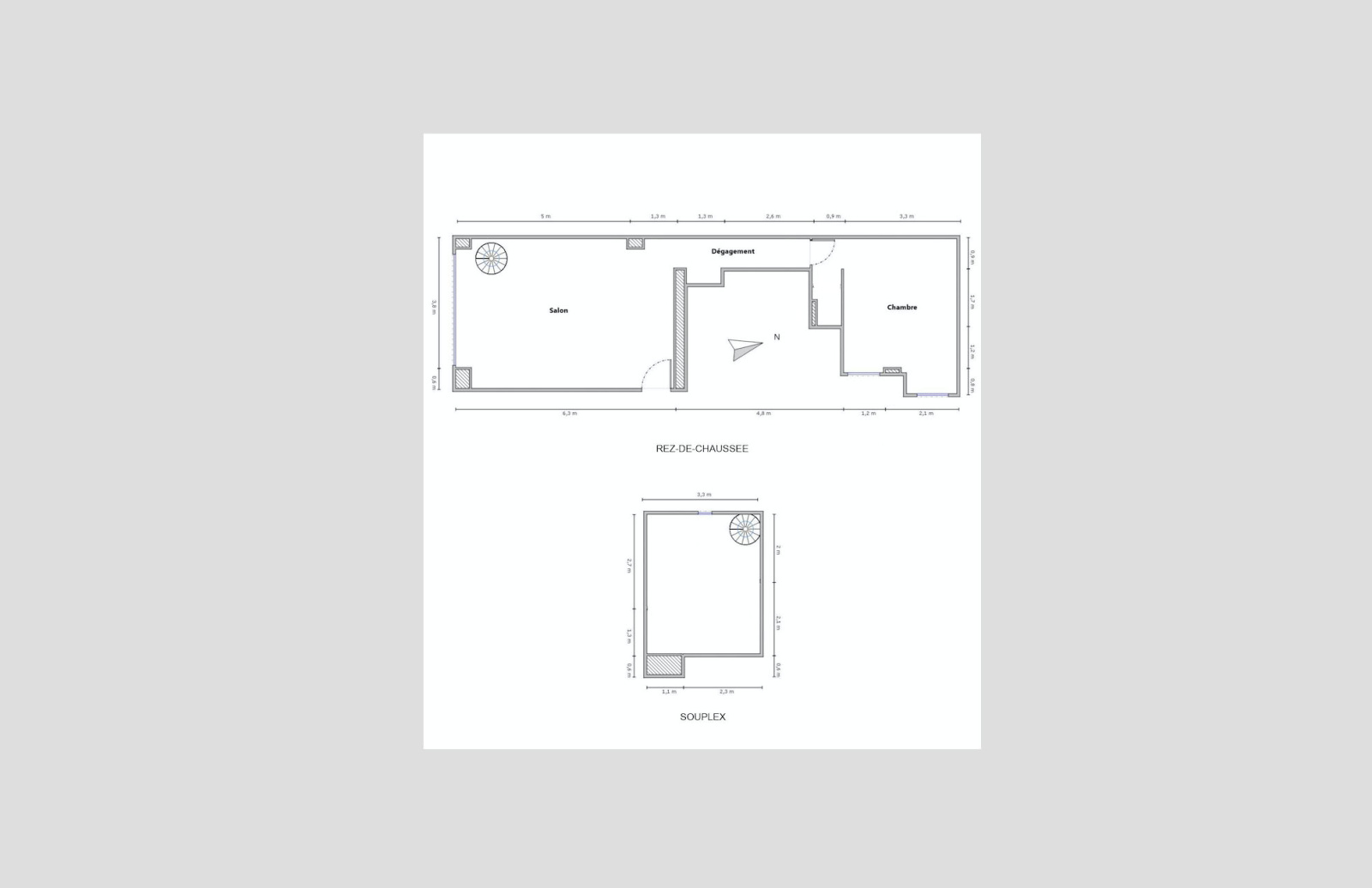 Il se compose en l’état d’un vaste salon de près de 30m² bénéficiant d’une grande hauteur sous plafond de plus de 3,10m et d’une grande chambre de plus de 16m². En souplex, une cuisine et une salle de bains.