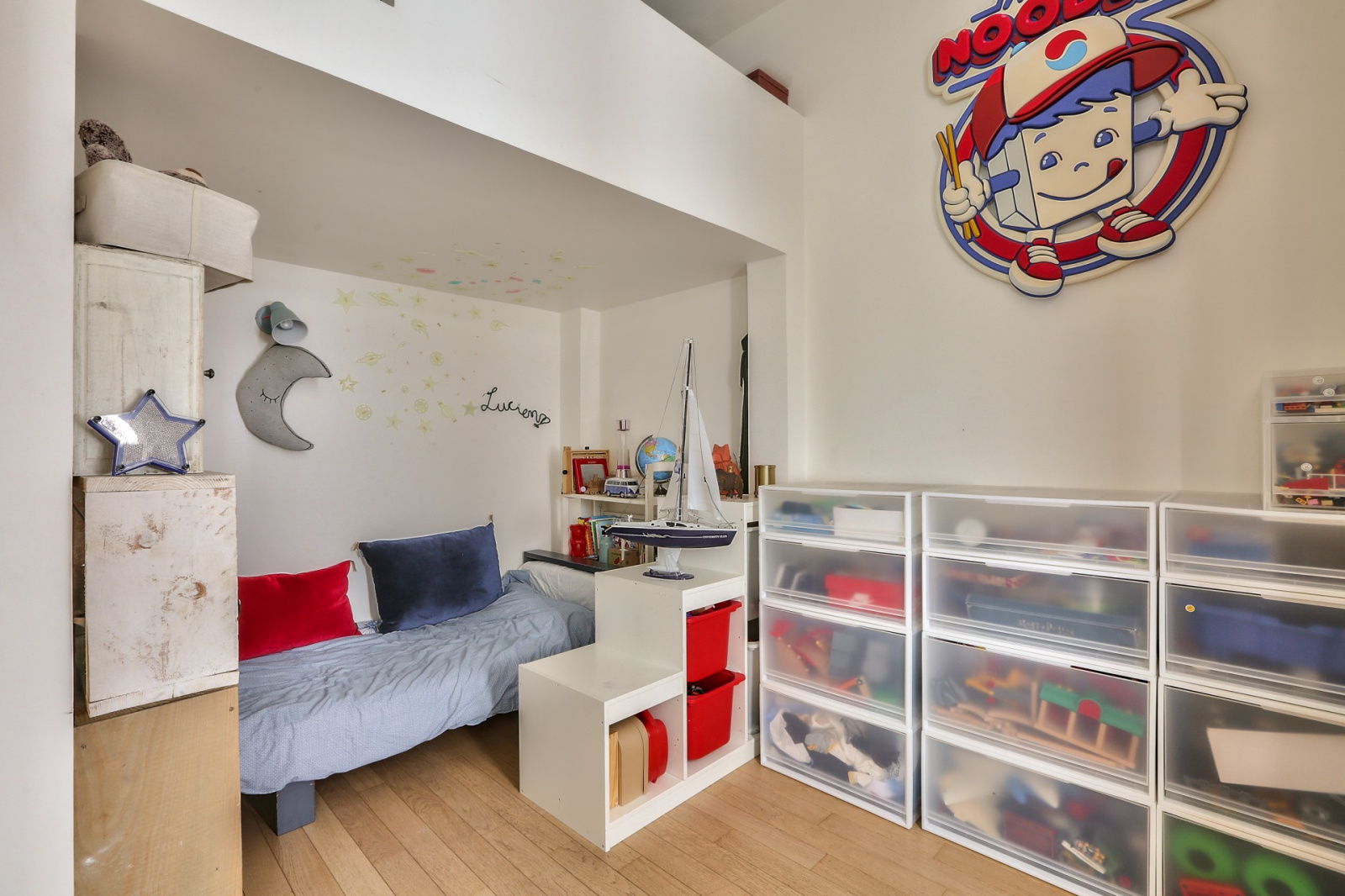Parquet, moulures, nombreux rangements, très bon plan, faibles charges, digicode, gardien.