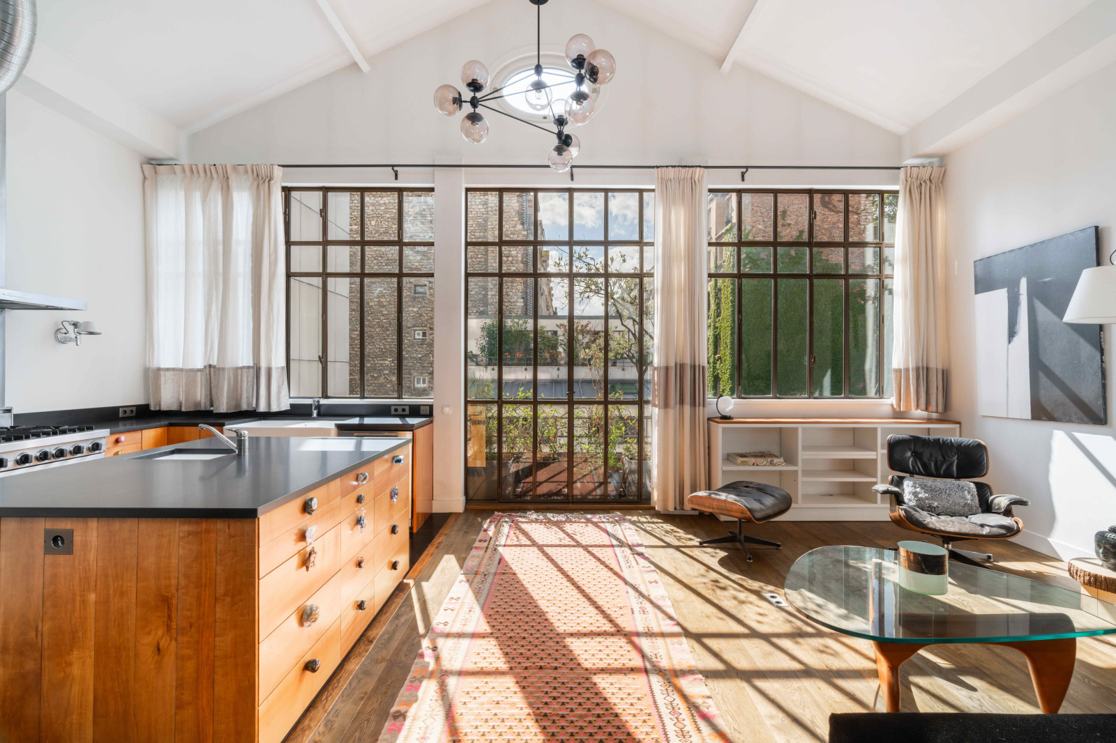 Baigné de lumière, son spectaculaire séjour au volume généreux, offre une vue cadrée panoramique sur la verdure du quartier.