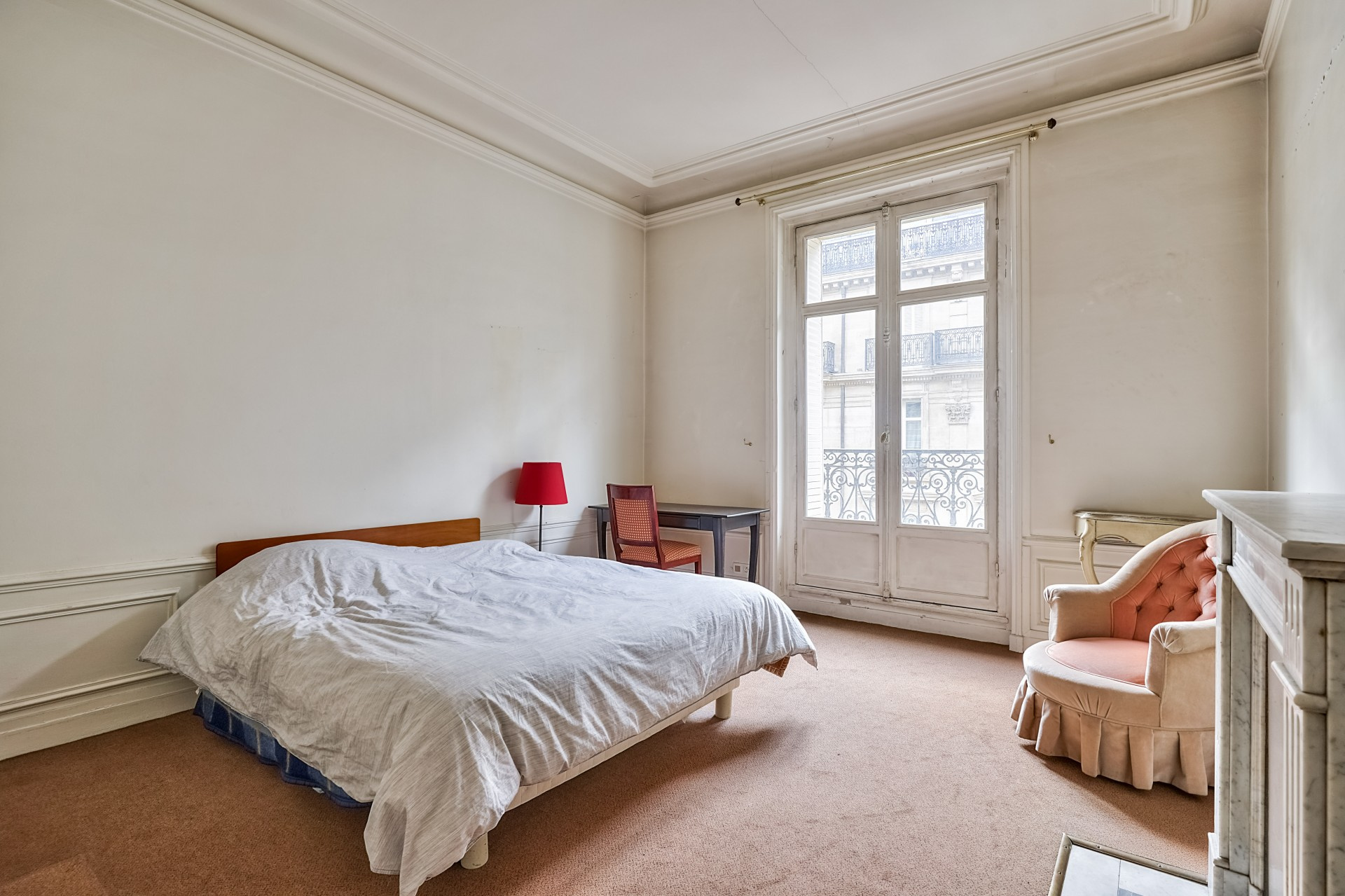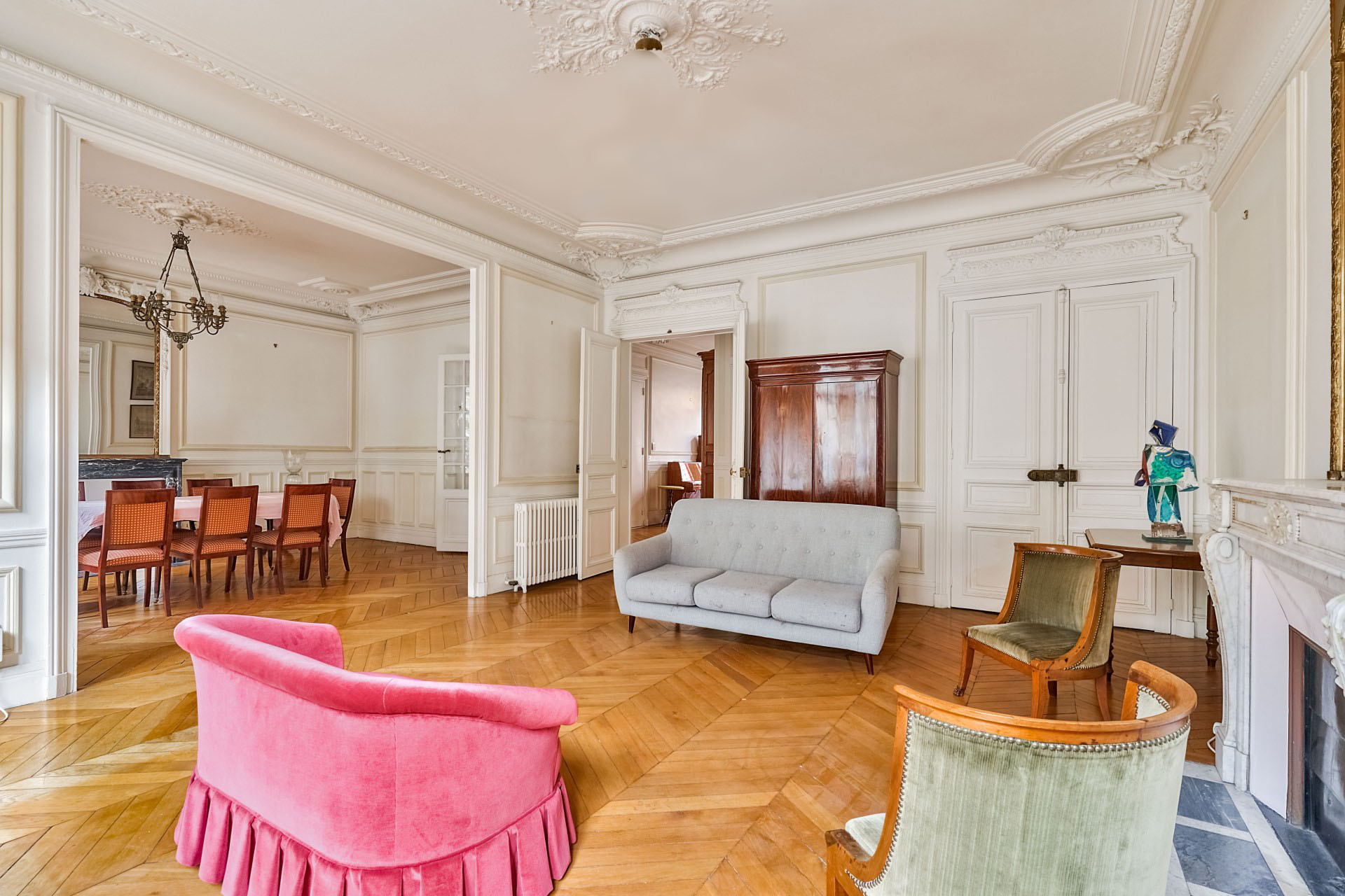 Au 3ème étage d’un bel immeuble Haussmannien avec ascenseur, un appartement lumineux à rafraichir de 169,2m² Carrez bénéficiant d’une belle hauteur sous plafond de 3,20m, de plusieurs cheminées, d’un parquet massif et de moulures.