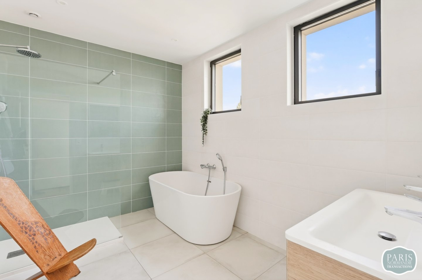 A l’étage, deux grandes chambres de 14 et 11m², une grande salle de bain de 8 m² avec une baignoire et une douche, un WC séparé et une terrasse donnant sur le jardin.