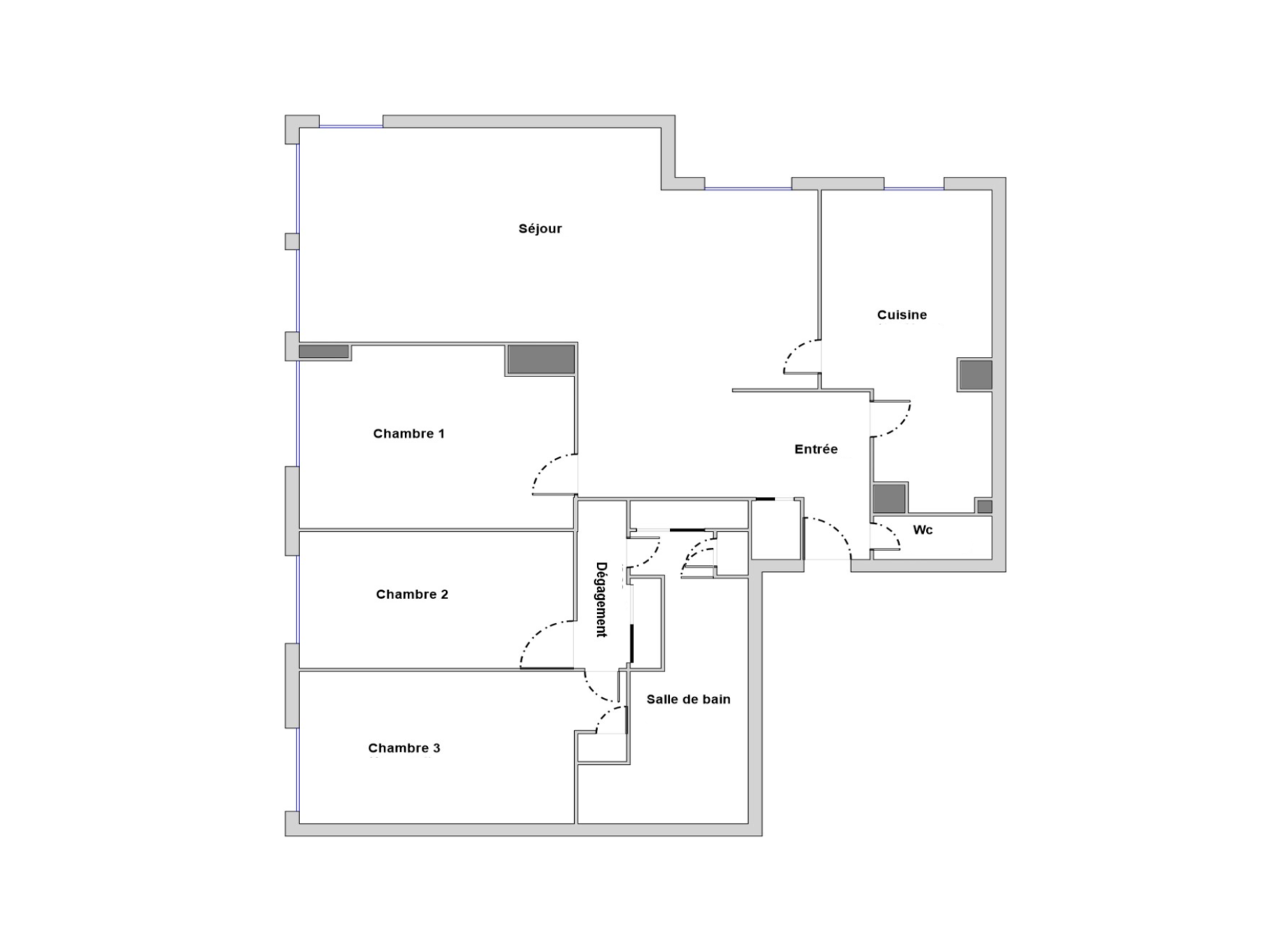 Très bon plan, fort potentiel, pas de murs porteurs, possibilité de faire une pièce de réception de plus de 45m2 avec une cuisine américaine.