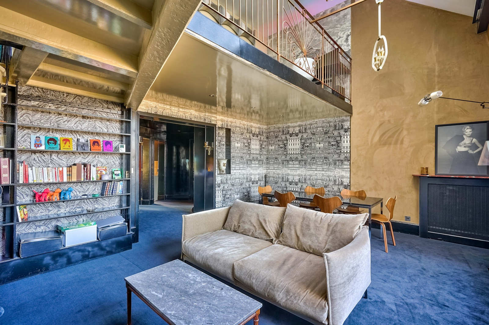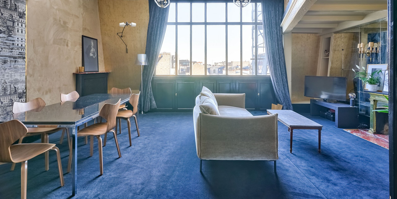 Il se compose d’une belle entrée avec rangements, d’une grande pièce de réception avec une magnifique cheminée de plus de 30m², plus de 5m de hauteur sous plafond, une grande verrière toute hauteur avec une vue imprenable sur les toits de Paris et la Villa des Ternes, d’une grande cuisine dinatoire équipée de 13m² (possibilité de créer une 3ème chambre et une cuisine américaine dans la pièce de réception), d’un WC indépendant, d’une chambre principale de plus de 13m² avec un dressing et d’une salle de bains. En duplex, une chambre de 11m² (possibilité de créer une salle de bains), un WC indépendant et un espace bureau et bibliothèque de 15m² ouvert sur la verrière.