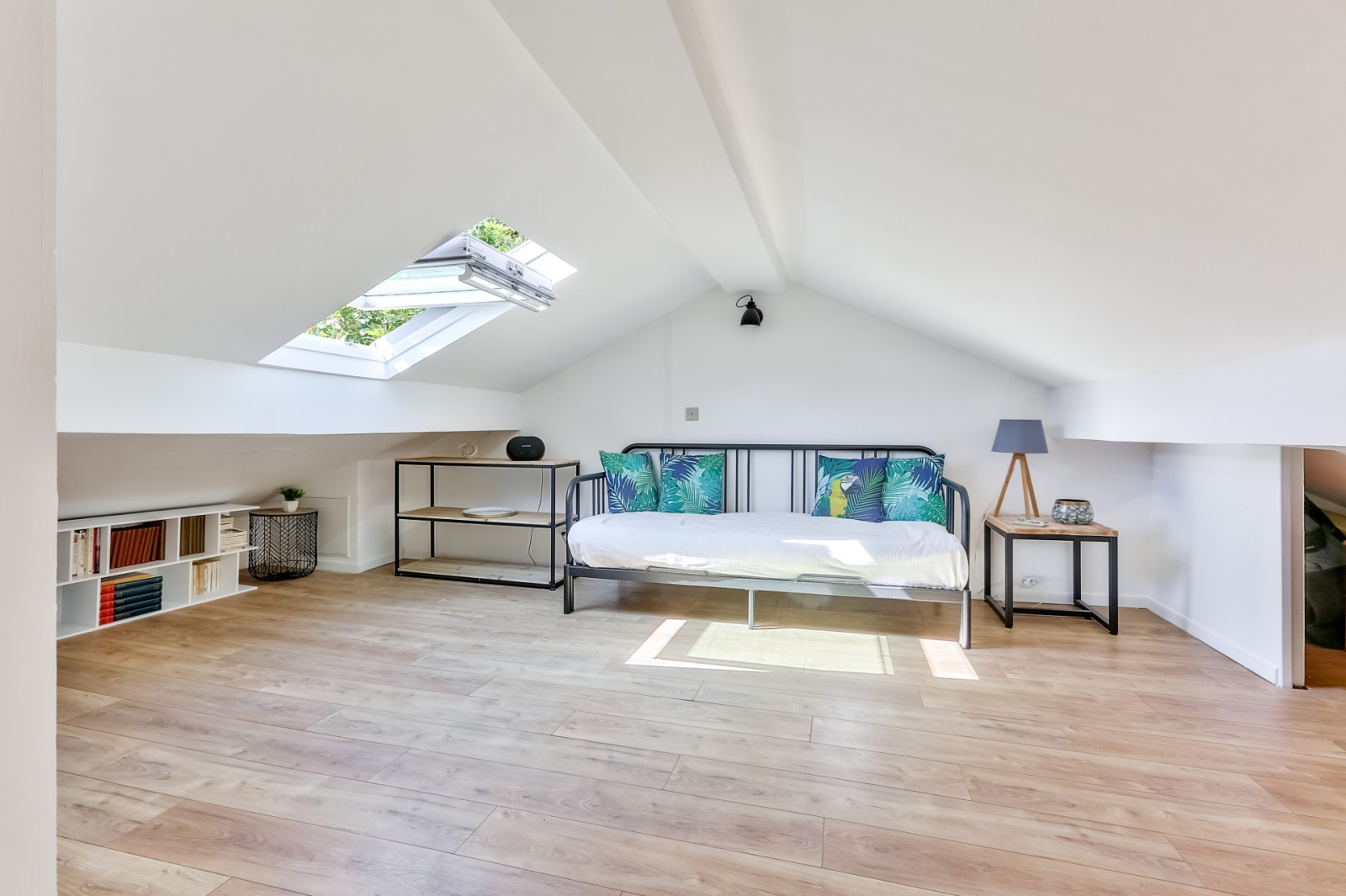 Elle se compose d’une pièce de réception traversante de plus de 42m² avec une cuisine américaine entièrement équipée donnant sur le jardin sans vis-à-vis, au 1er étage une très grande chambre mansardée de 29m² avec de nombreuses possibilités d’aménagements. A l'entresol, une belle chambre de 13m², une seconde chambre ou un bureau d’environ 9m², une salle de bains et un WC indépendant. Nombreux rangements sur mesure. Chauffage au gaz.