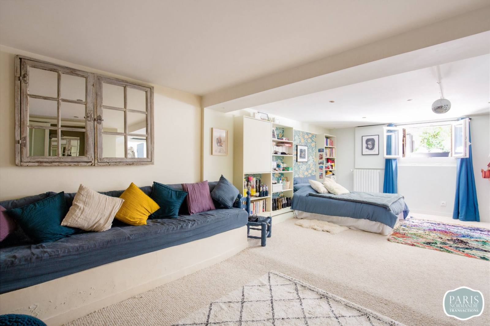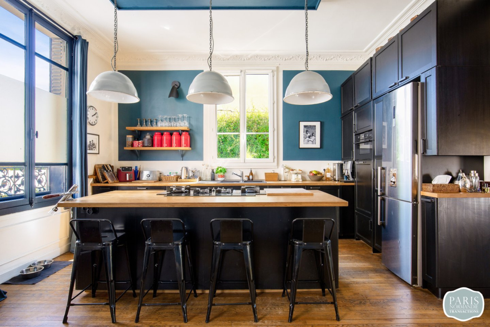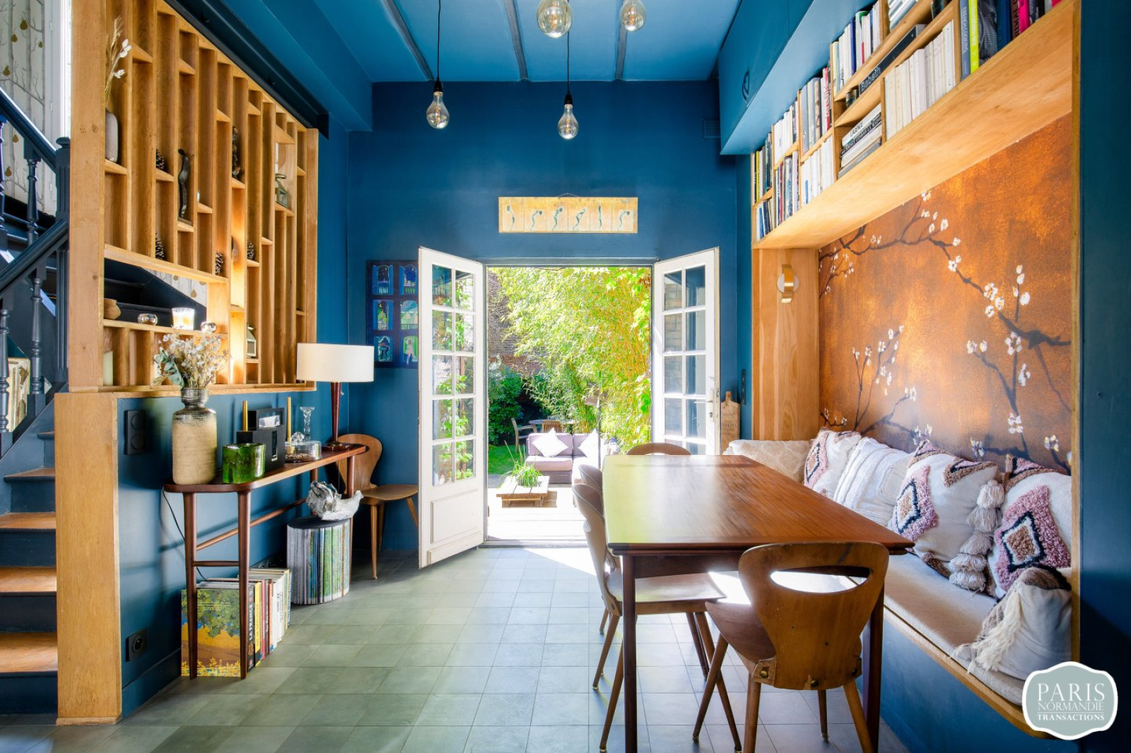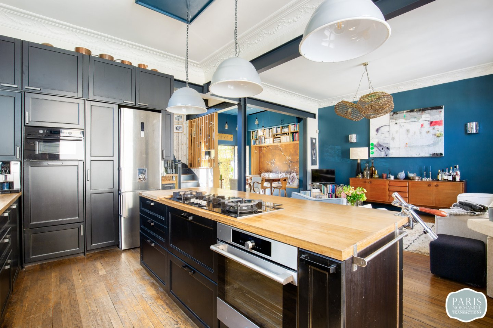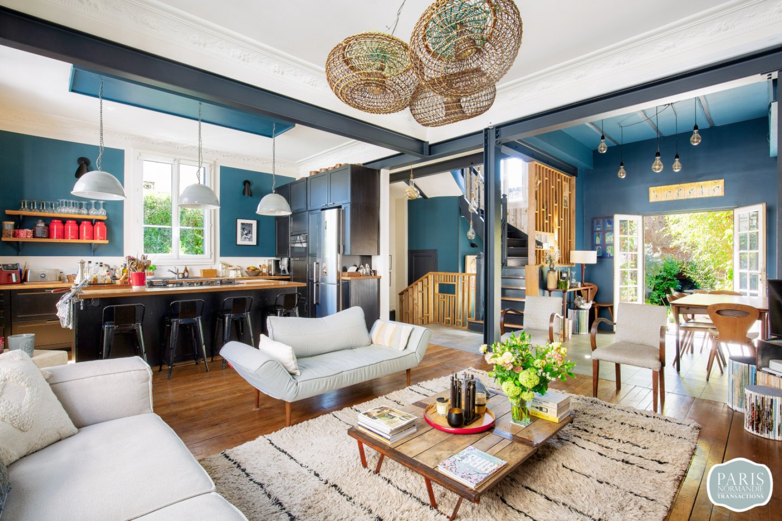 Elle se compose d’une petite entrée, de WC invités, d’une grande pièce de réception traversante à l’esprit loft de 55m² avec une grande cuisine américaine équipée et un espace salle à manger, l’ensemble bénéficiant d’une hauteur sous plafond de plus de 3 mètres et donnant sur un grand jardin exposé Sud-Ouest de plus de 150m².