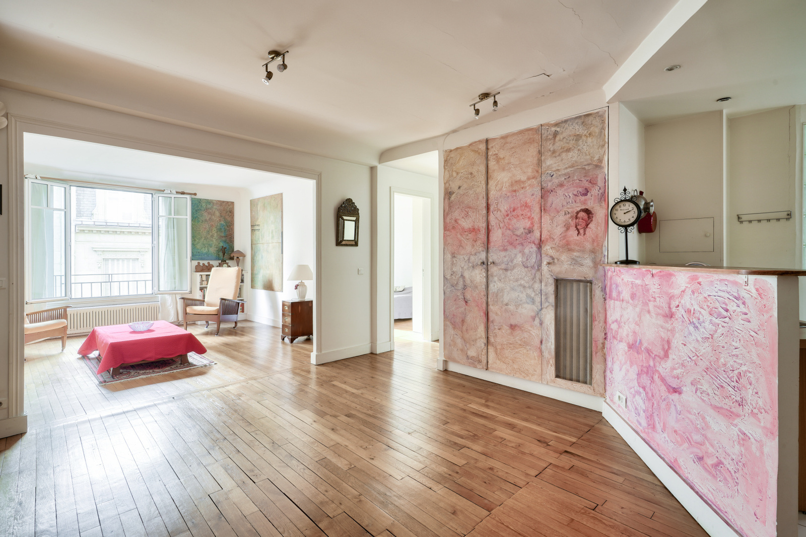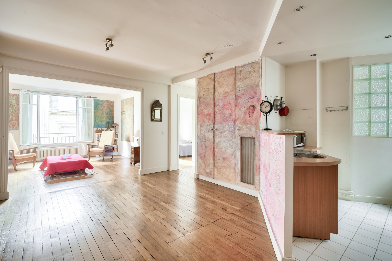 Nombreux rangements, parquet ancien, double vitrage, interphone, digicode, gardien, chauffage collectif.