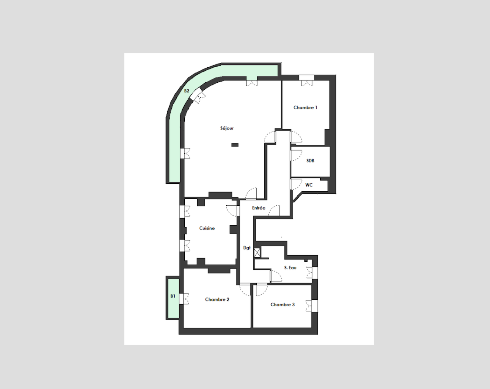Il se compose d’une entrée, d’un grand double séjour de plus de 41m² avec trois grandes double fenêtres donnant sur un balcon filant ensoleillé de 9m², d’une grande cuisine dinatoire équipée de 14m², d’un WC invités, de trois chambres (11,12 et 16m²), d’une salle de bains et d’une salle de douche avec son WC. Possibilité de rajouter une 4ème chambre sans modification de plan.