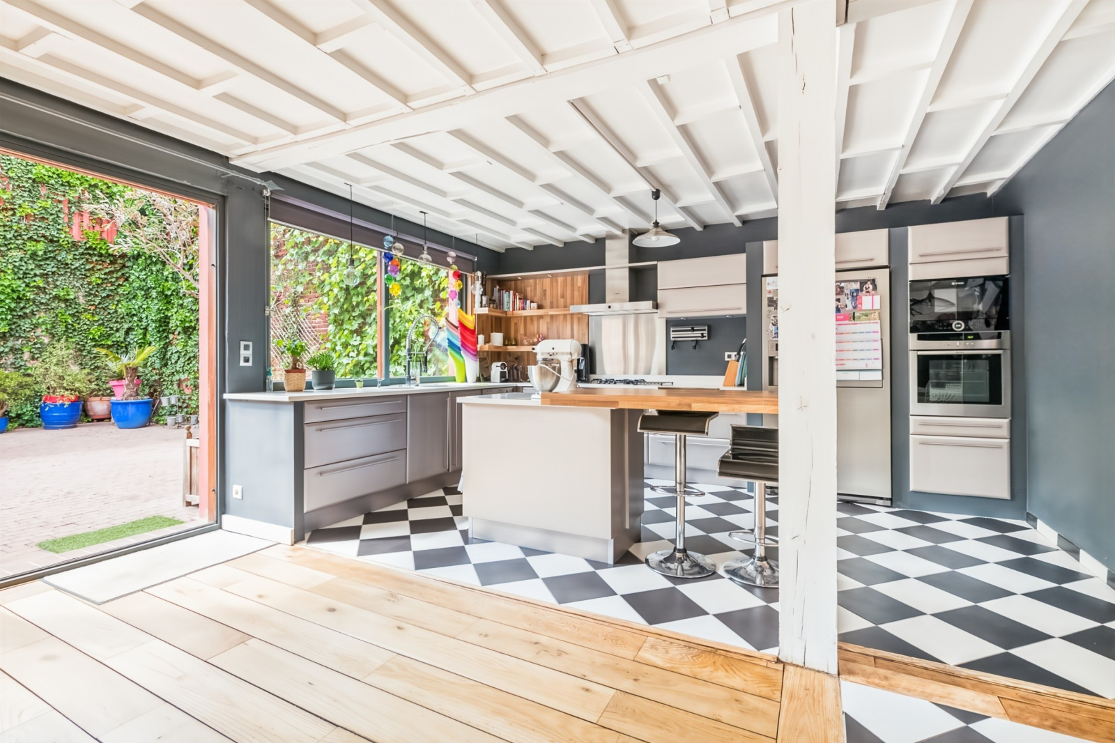 Insoupçonnable depuis la rue, on y accède via un préau ouvert.