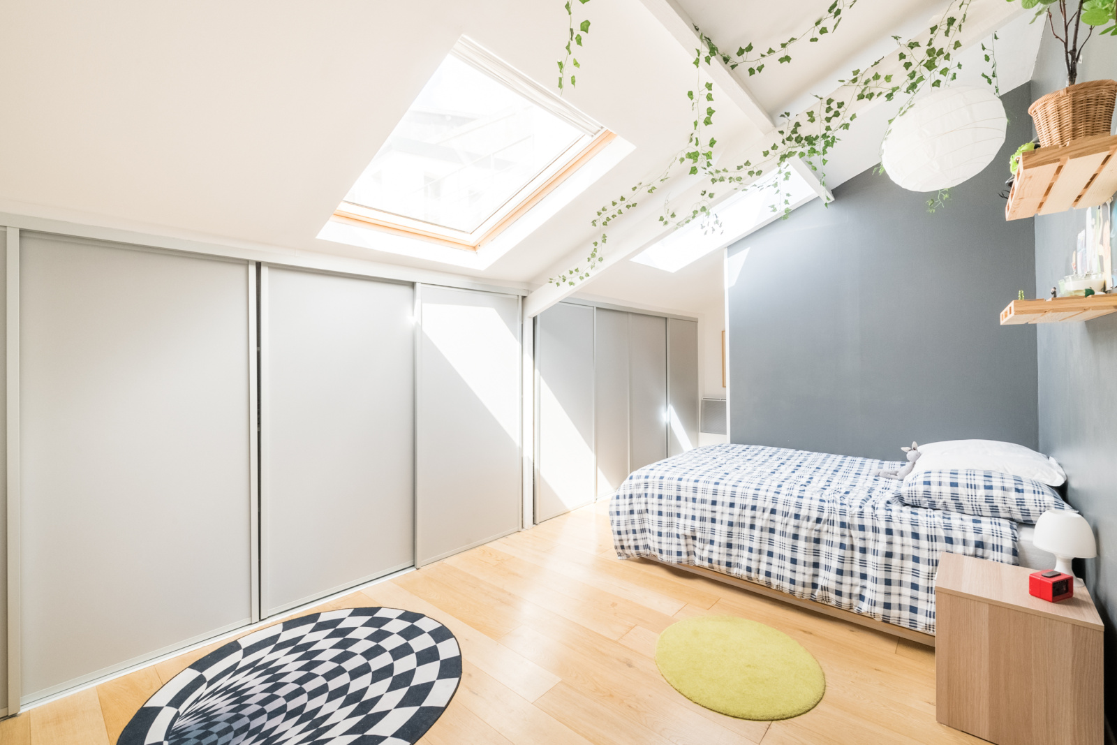 Deux escaliers alliant bois et ferronnerie conduisent au second niveau vers l'espace nuit, l'un vers deux chambres intégrant de nombreux rangements et partageant une salle d'eau commune, l'autre sur une très spacieuse suite parentale incluant un dressing et une salle de bains.