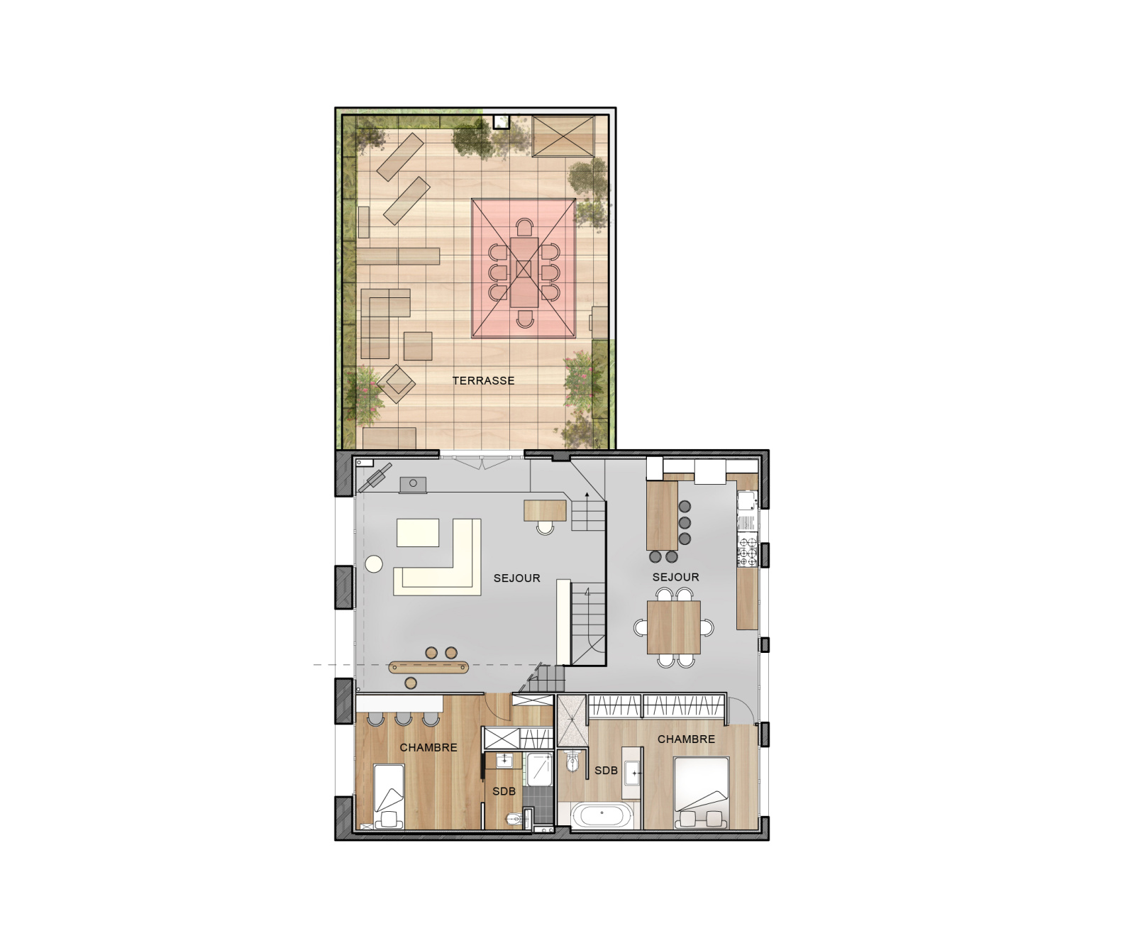 En mezzanine, une quatrième chambre ou un espace de télétravail de 24m² au sol.