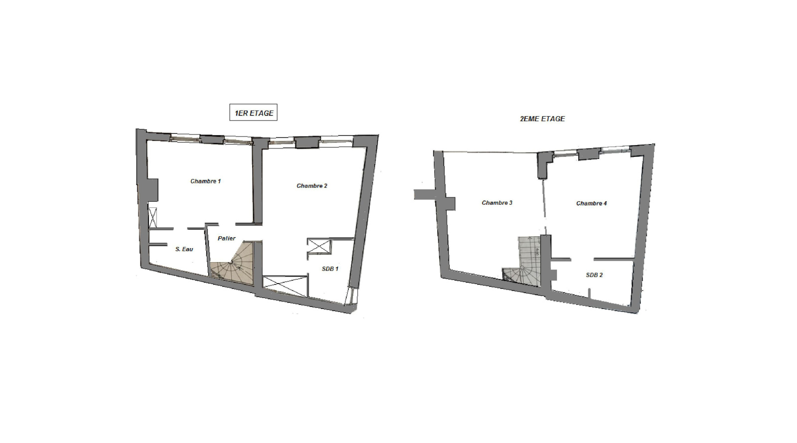 Au 1er étage, deux chambres (12 et 19m²), chacune avec leur salle de bains et WC.