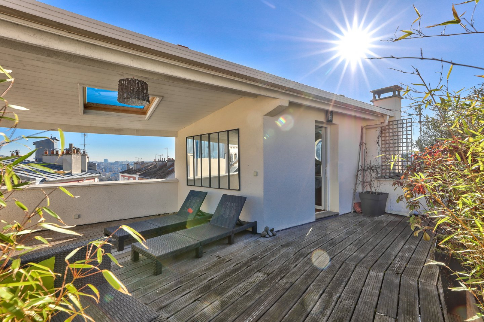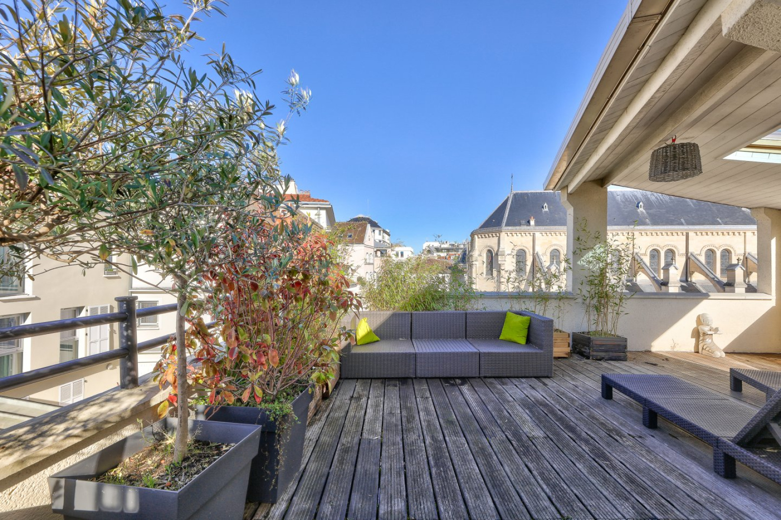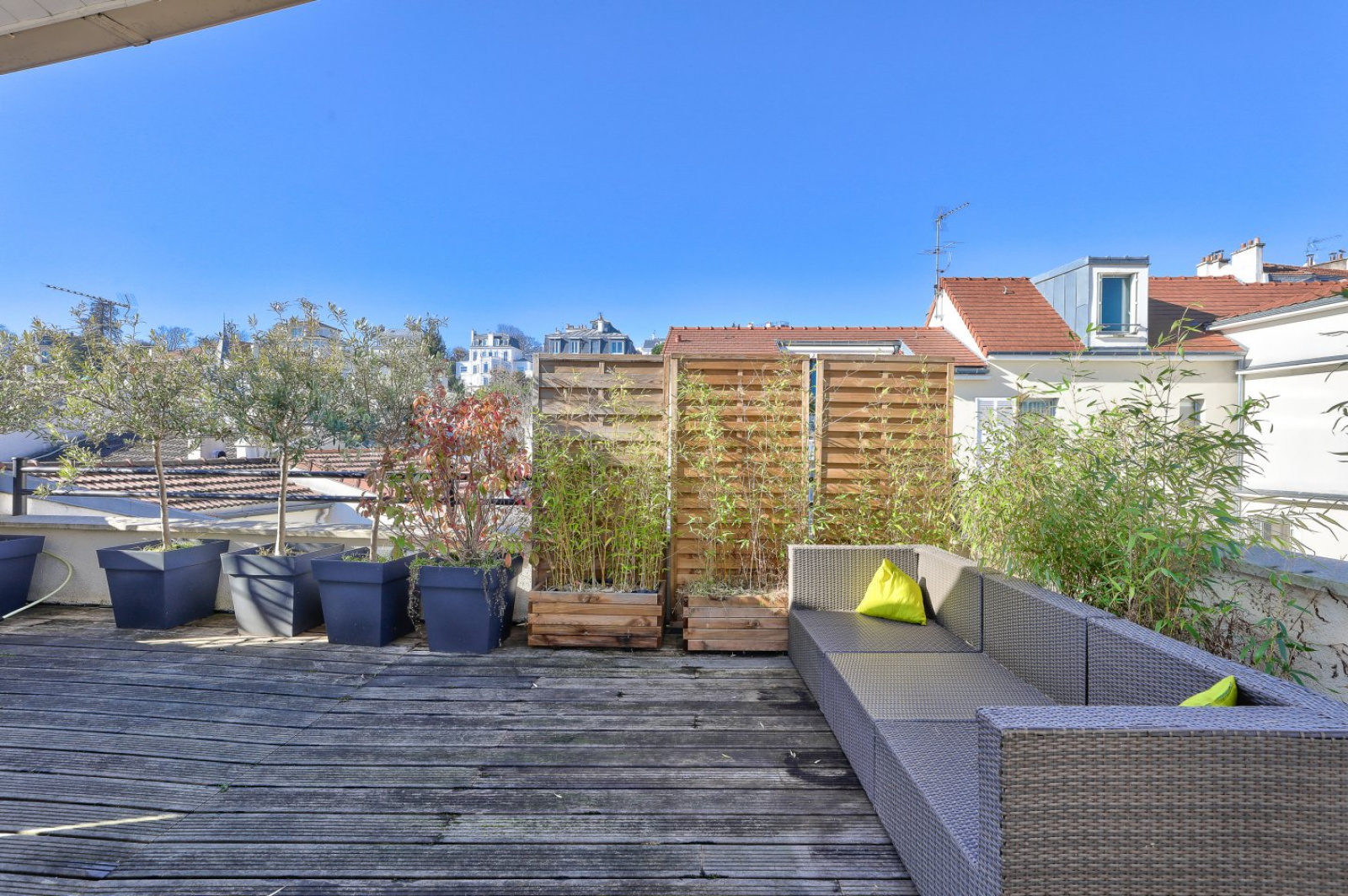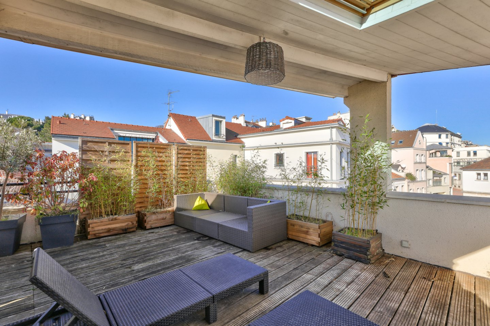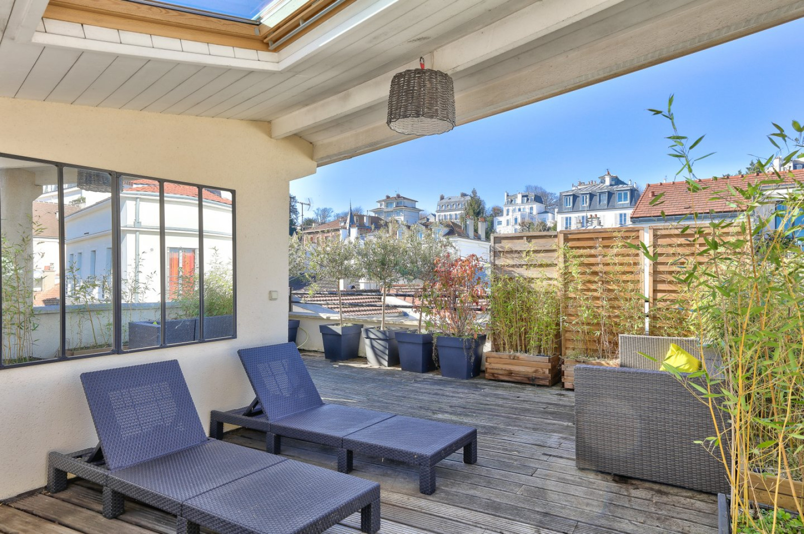 En roof top, une cuisine d’été équipée donnant sur une terrasse plein ciel de 33m² bénéficiant d’une superbe vue sur les toits et l’église de Saint-Cloud.