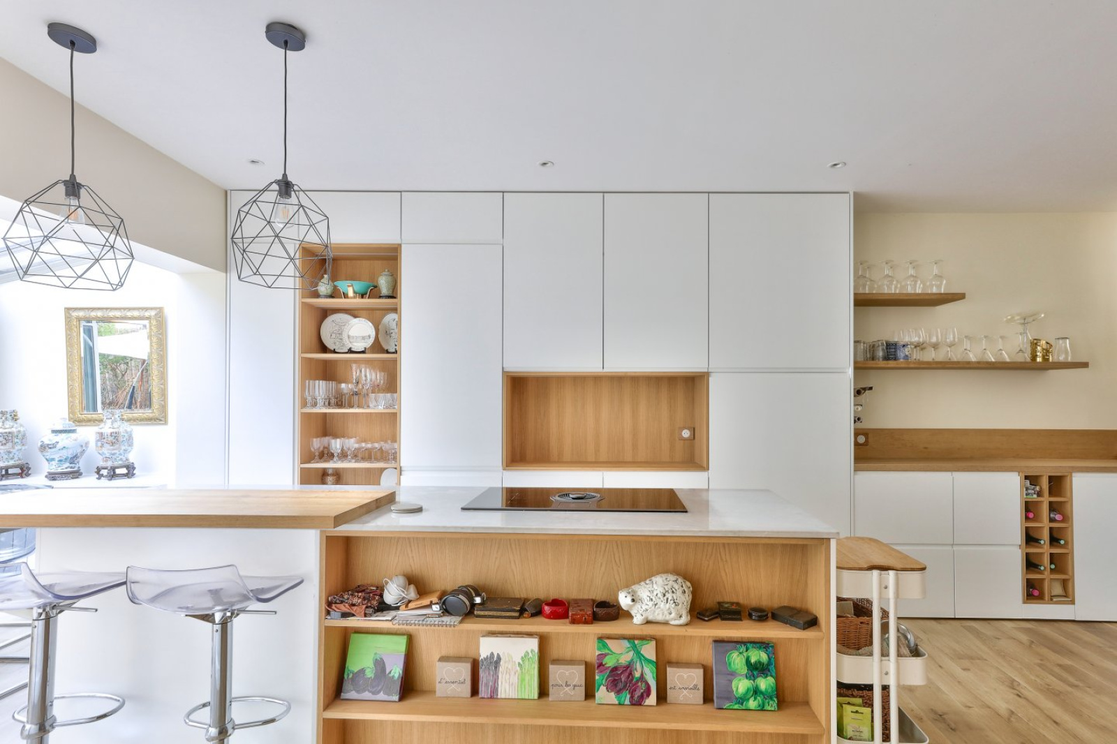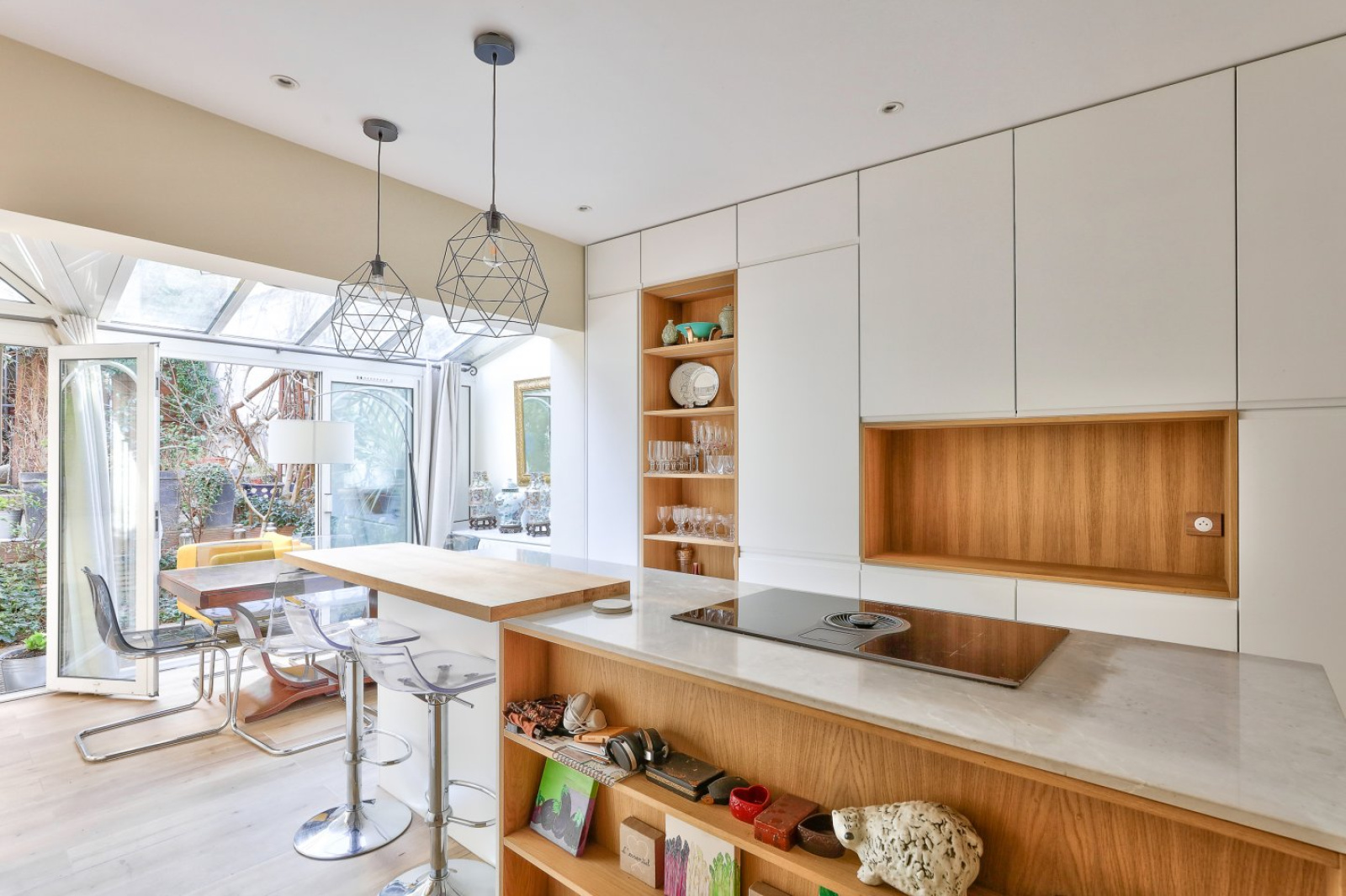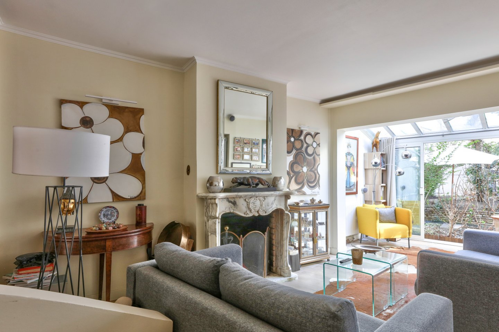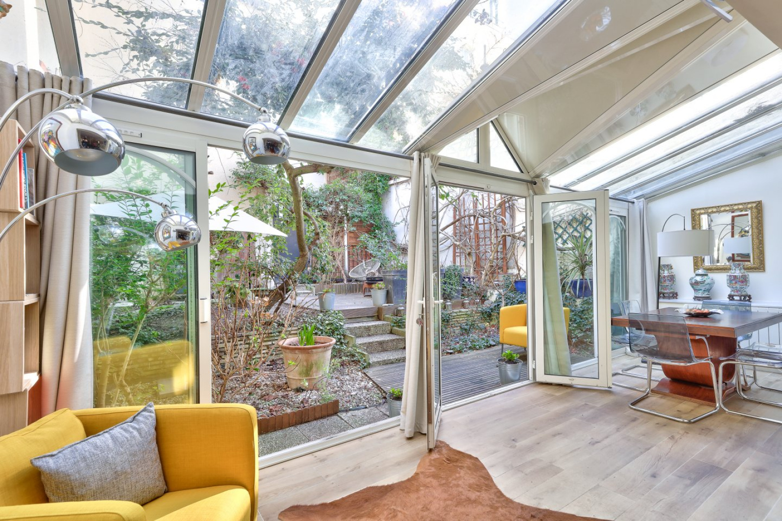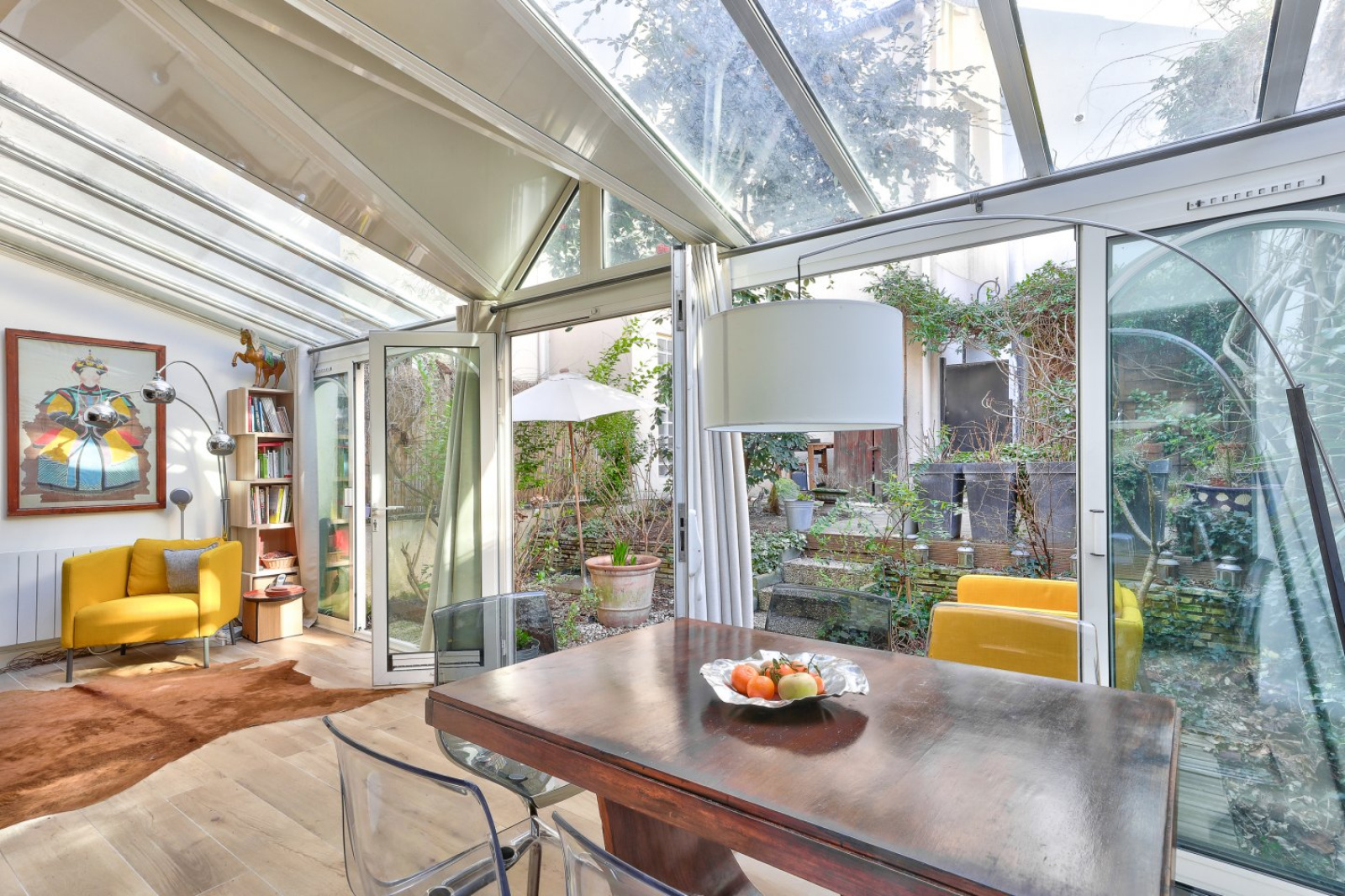 Elle se compose, en rez-de-jardin, d’une vaste pièce de réception ensoleillée avec véranda et d’une cuisine américaine de plus de 54m² ouvrant sur une grande terrasse arborée de 46m².