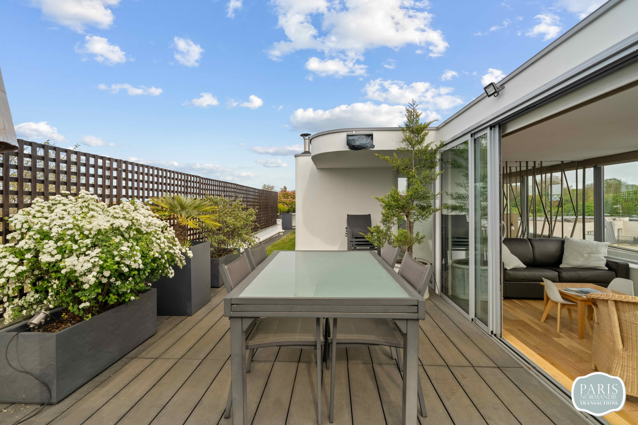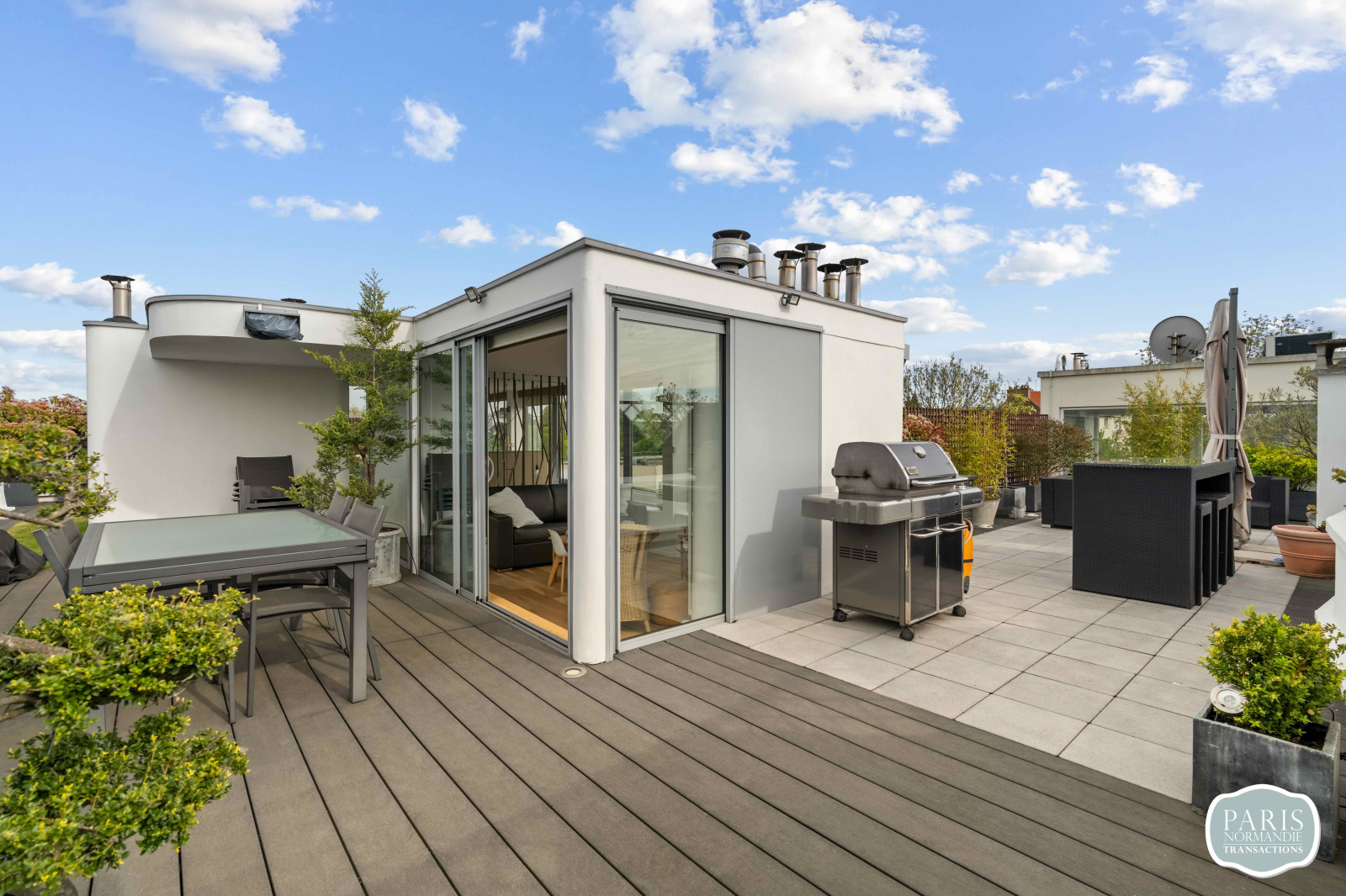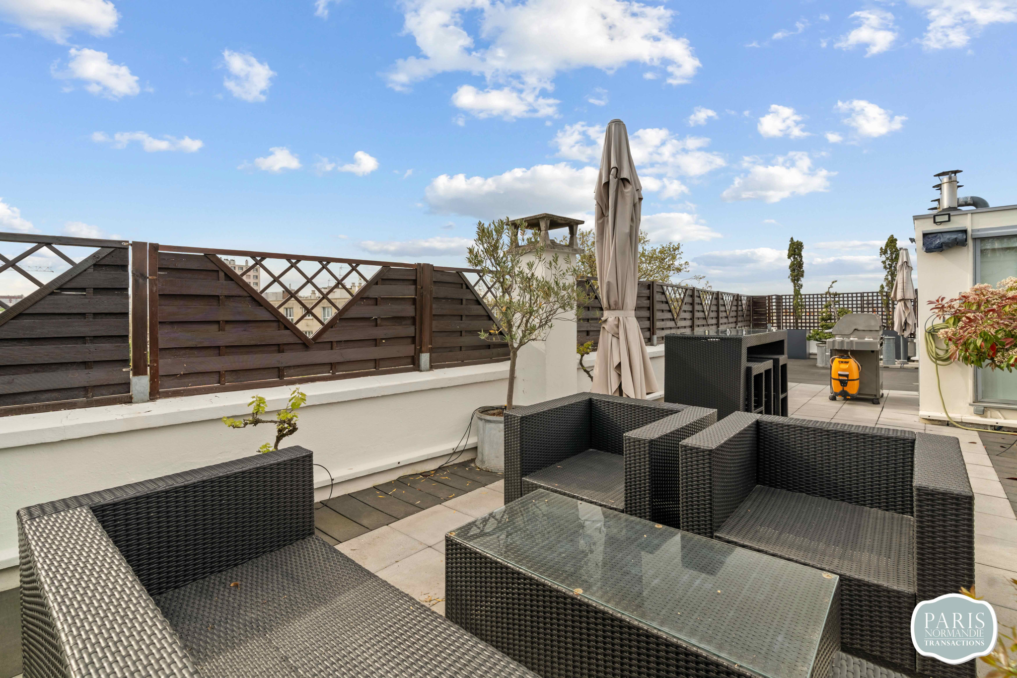 Au second niveau, un salon d'été avec cuisine attenante prolonge la vie vers l'extérieur. Il ouvre sur un Rooftop végétalisé de plus de 110 m², sans aucun vis-à-vis, offrant une vue panoramique sur Paris et la Tour Eiffel. Cet espace vitré unique peut facilement être repensé en troisième chambre avec salle d'eau et dressing, selon vos besoins.