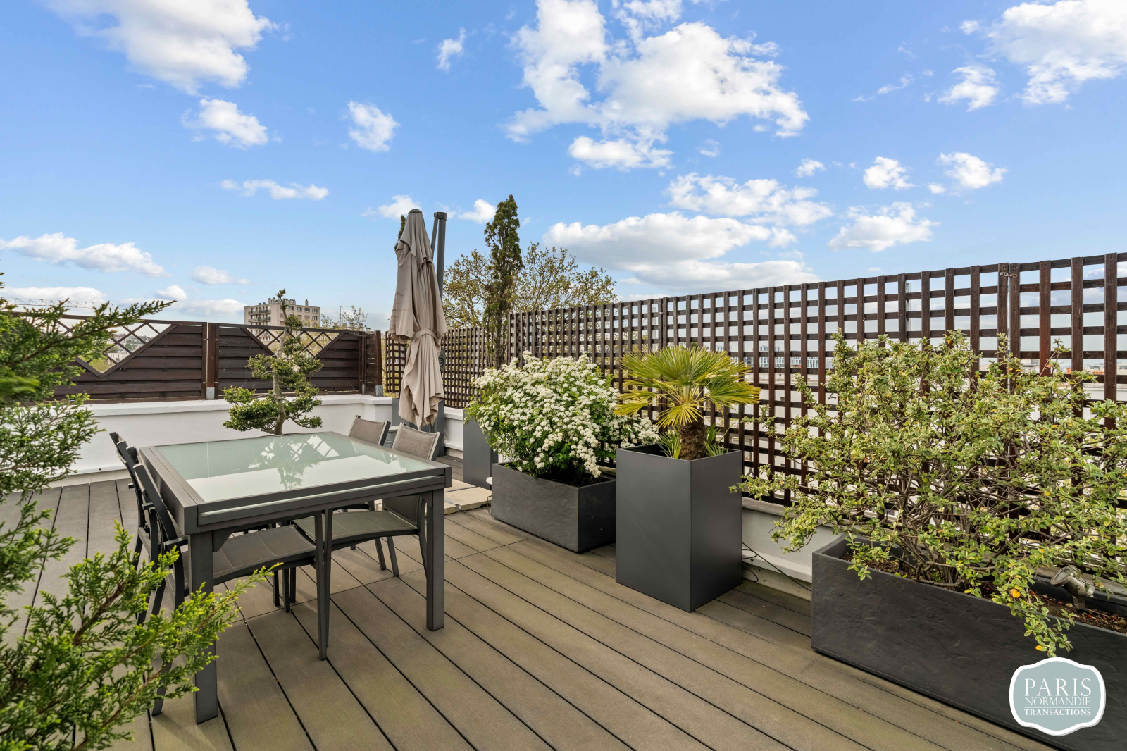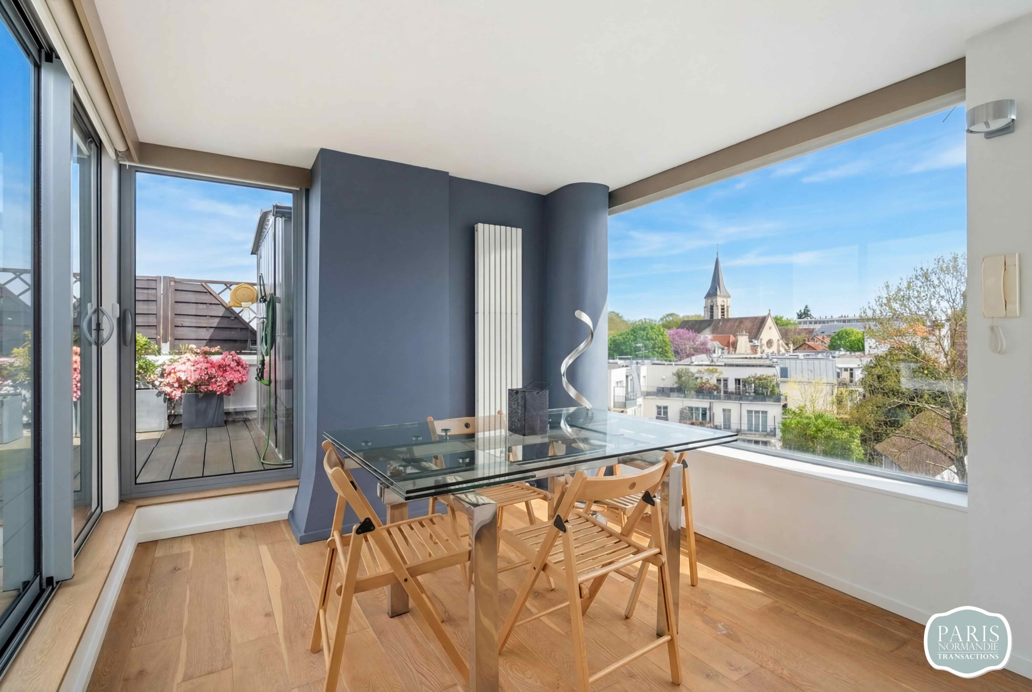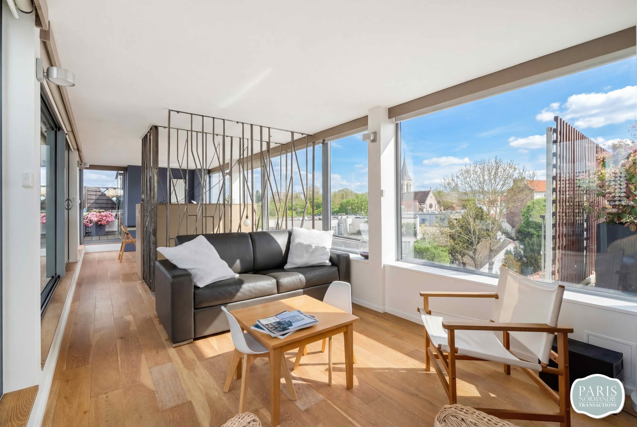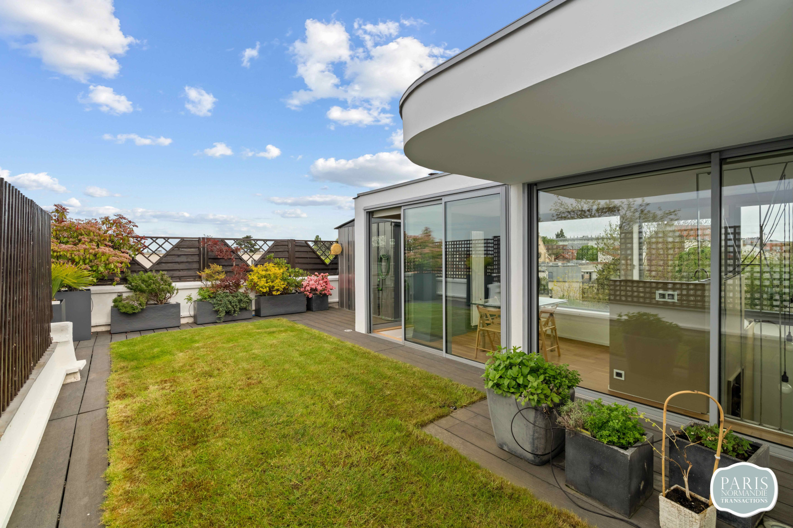 Au second niveau, un salon d'été avec cuisine attenante prolonge la vie vers l'extérieur. Il ouvre sur un Rooftop végétalisé de plus de 110 m², sans aucun vis-à-vis, offrant une vue panoramique sur Paris et la Tour Eiffel. Cet espace vitré unique peut facilement être repensé en troisième chambre avec salle d'eau et dressing, selon vos besoins.