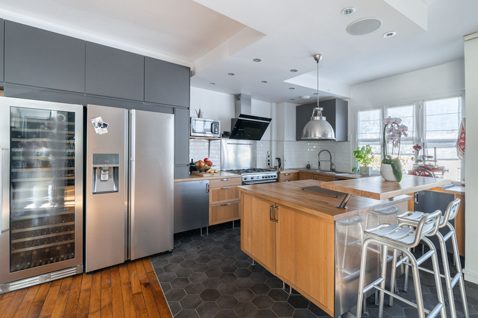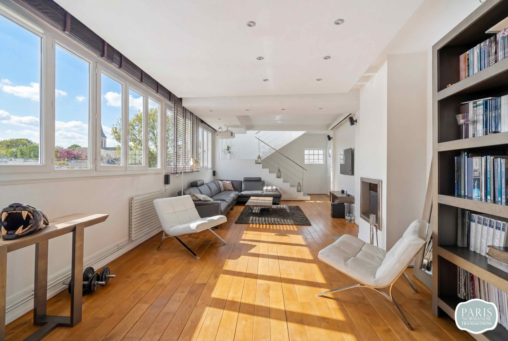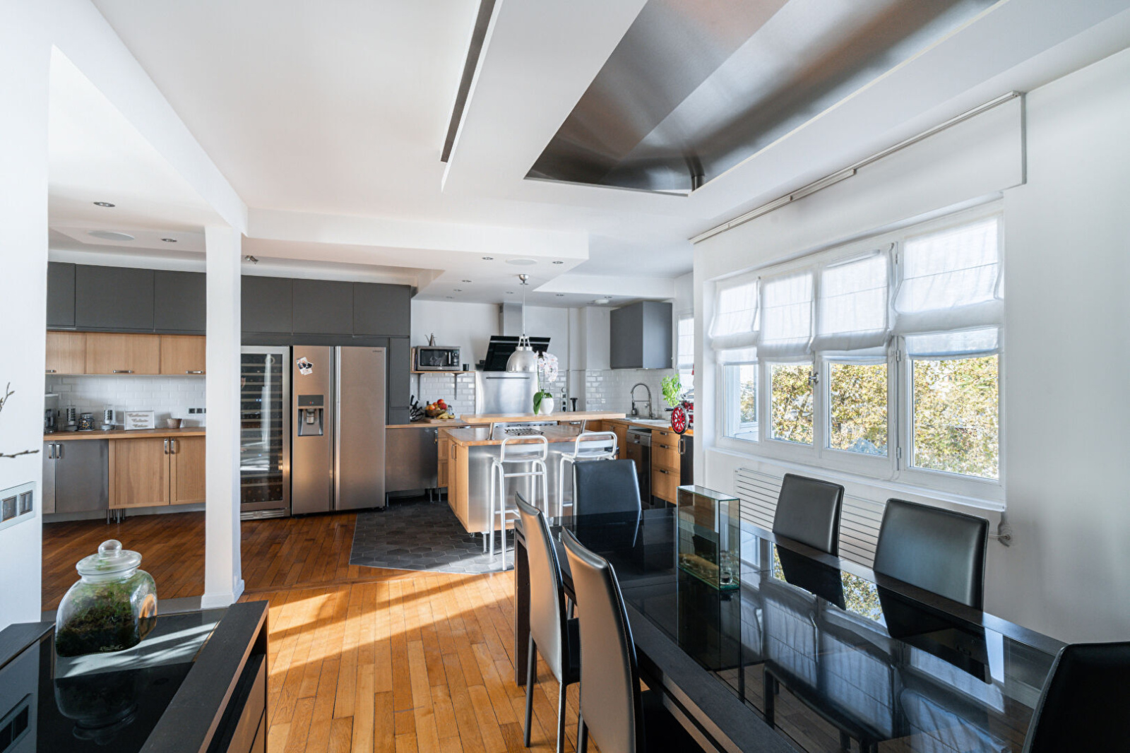 Il se compose au premier niveau de nombreux rangements sur-mesure, coin bureau intégré, pièce de vie de plus de 74 m², pleine de lumière grâce à ses larges surfaces vitrées et sa triple exposition. La cuisine est ouverte, aménagée autour d'un îlot central et s’ouvre d'un côté sur la salle à manger, et de l'autre sur un agréable salon avec cheminée.